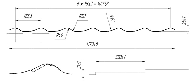 Полезная ширина стандартного листа металлочерепицы супермонтеррей составляет 1 100 мм при габаритной ширине, равной 1 190 мм. Максимальная длина может составлять до 8 метров, но специалисты рекомендуют использовать листы длиной не более 5 метров. Шаг штамповки (период волны) равняется 350 мм.