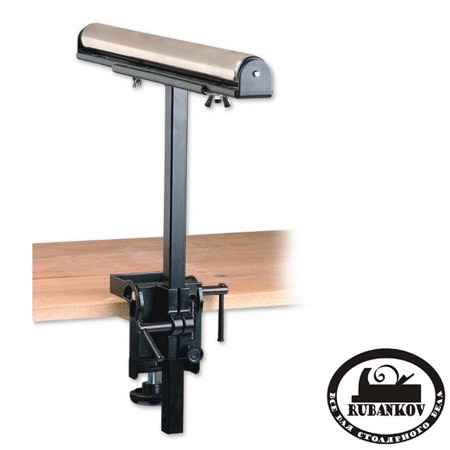 Роликовая опора с шириной ролика 450 мм. Ролик выполнен из стали и посажен на два металлических шарикоподшипника. Устанавливается на столешницу толщиной от 20 до 65 мм. Диапазон регулировки по высоте от 76 до 388 мм от опоры - струбцины. Устанавливается как на горизонтальную, так и на вертикльную столешницу. Возможность поворота ролика на 90 градусов и смещения его в сторону от центральной оси на 89 мм. Материал корпуса - сталь с порошковой окраской. Диаметр ролика 38 мм. Максимальная нагрузка на ролик - 40 кг. Масса 2.7 кг. Производство Piher (Испания).