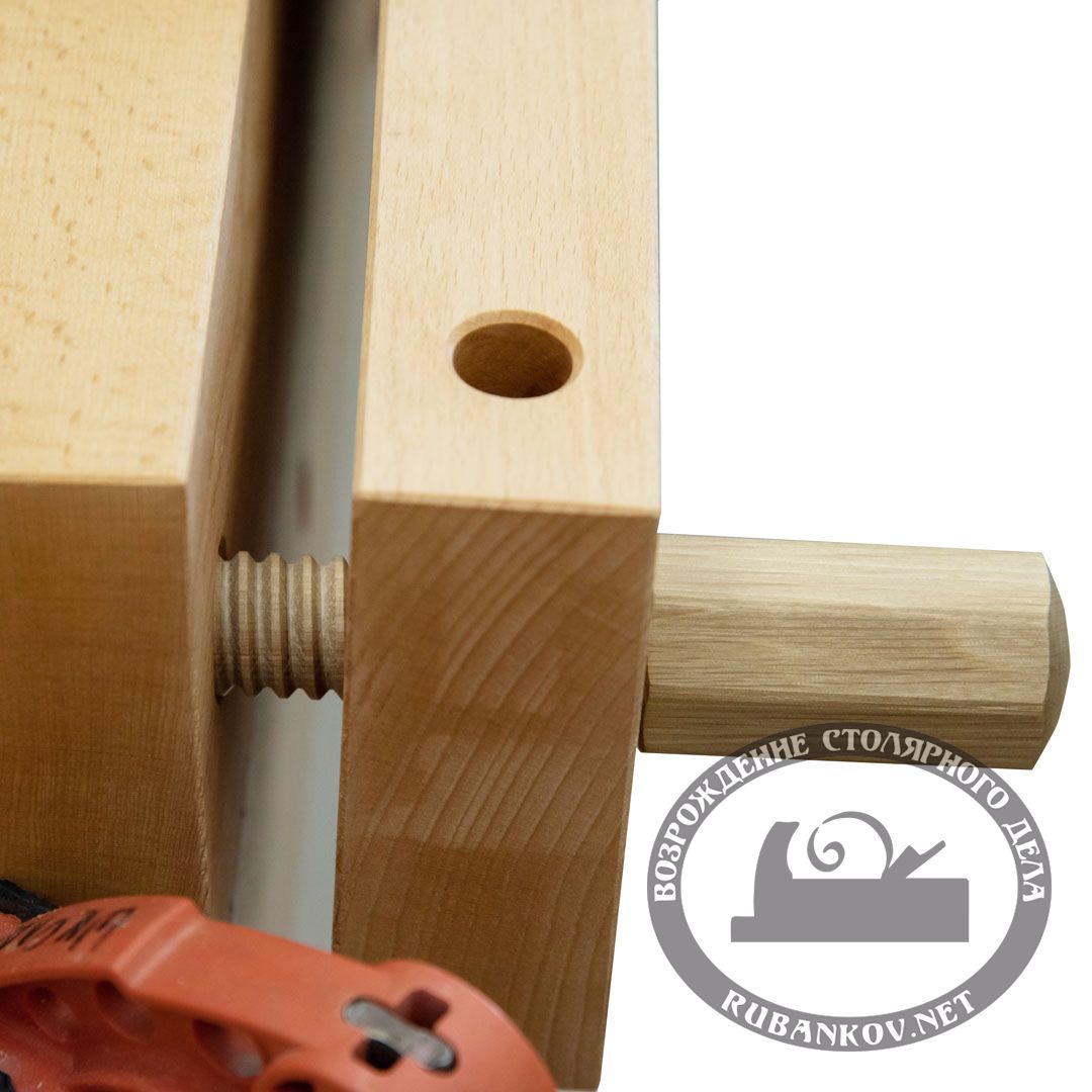 Для удобства фиксации заготовок в столешнице просверлены отверстия диаметром 19мм: 12 отверстий в столешнице и 4 в передней губке тисков. В отверстия устанавливаются колки, которые служат упорами для заготовки. Прижимная губка тисков с двумя винтами жёстко фиксируют заготовку.