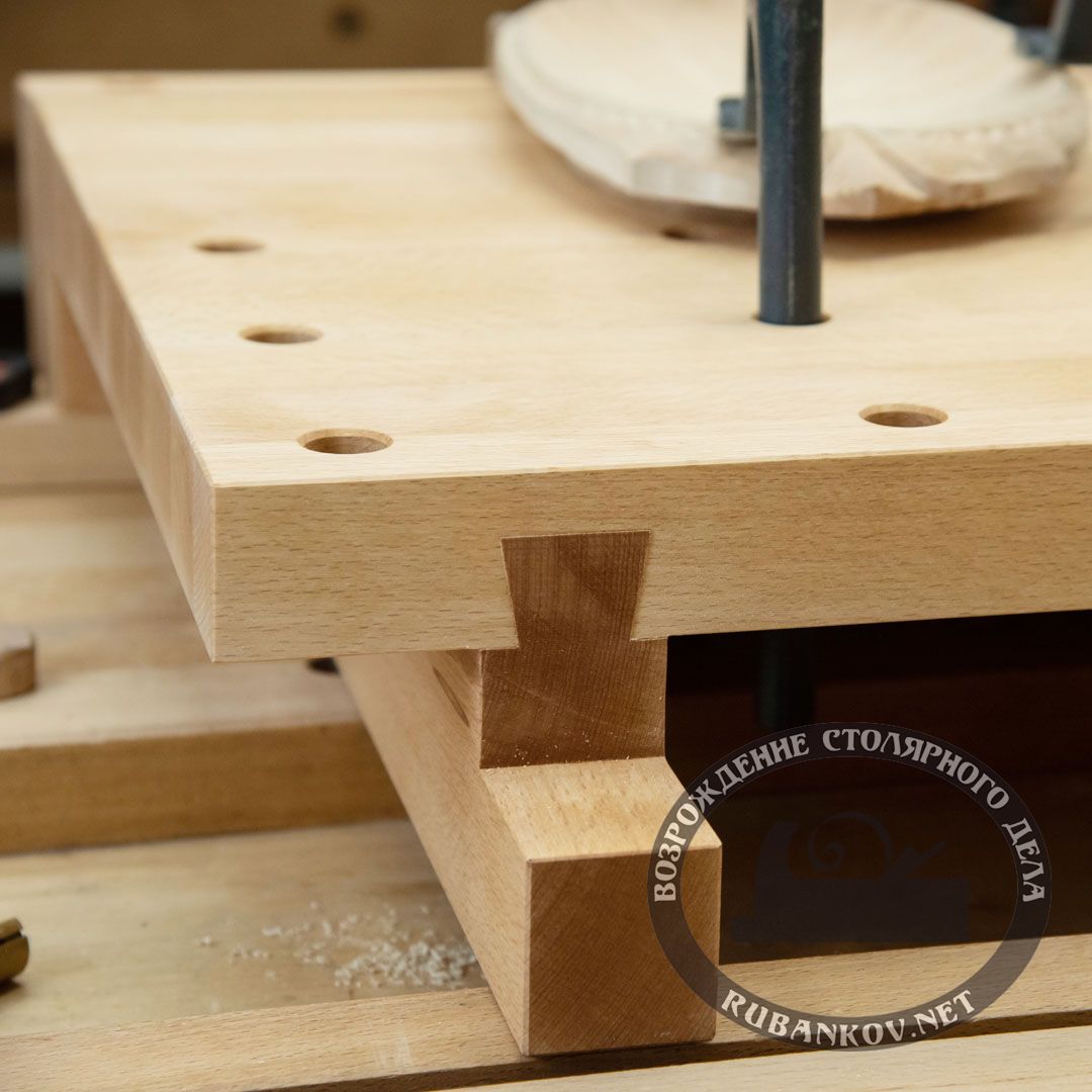 Конструкция представляет из себя стол с тисками и выполнена при помощи классических столярный соединений, что обеспечивает им высокую прочность и стабильность. Значительная толщина верхнего щита и высота самих тисков позволяет использовать в качестве прижимов валеты или струбцины. Материал столешницы - древесина бука, винты выполнены из граба. Изделие полностью покрыто маслом для дерева.