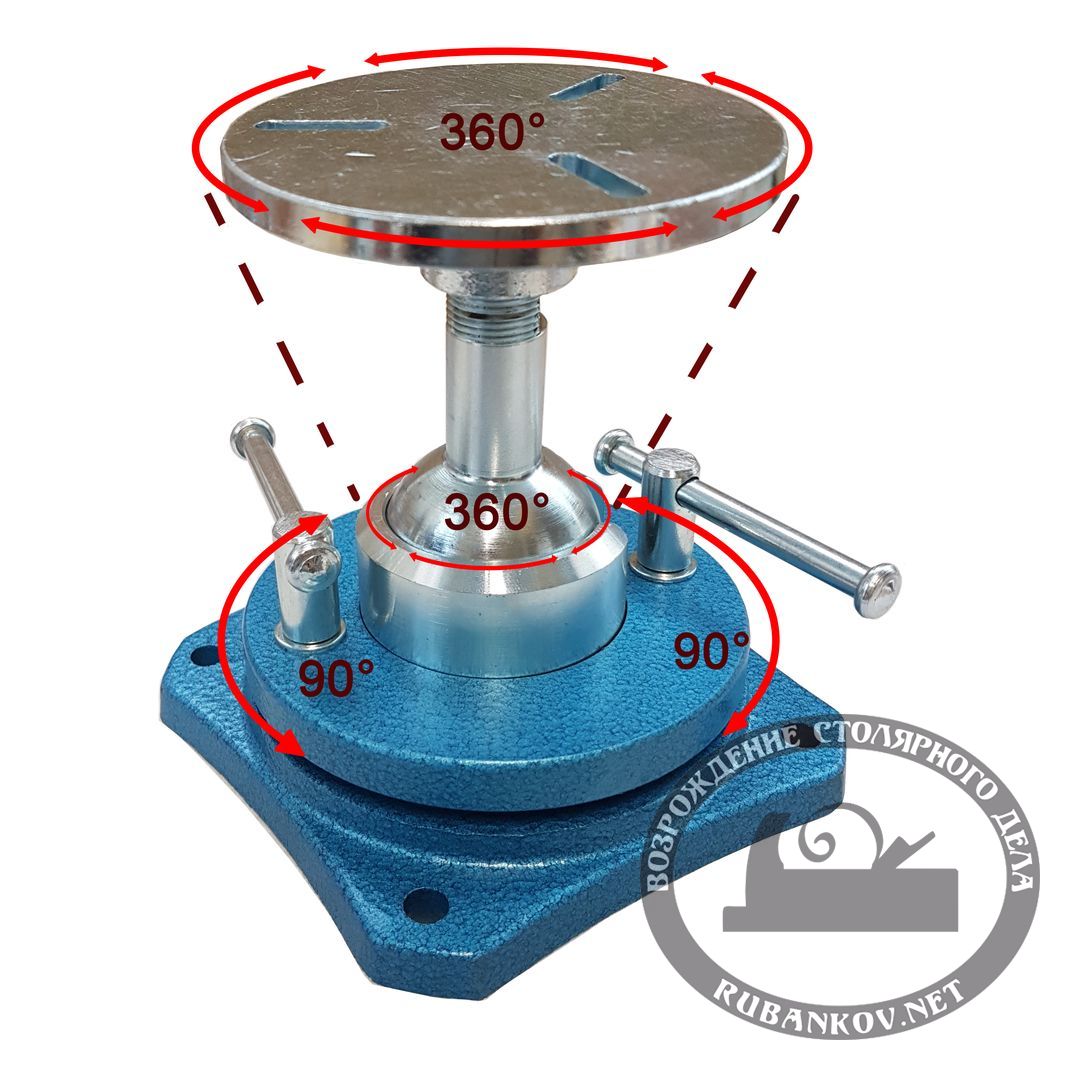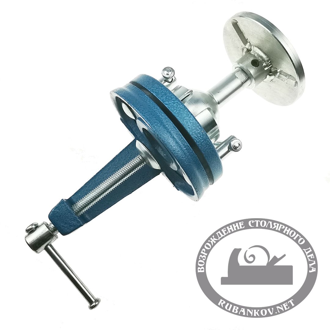 Резчицкие тиски c наклонной площадкой диаметром 100 мм. С этими тисками вы можете устанавливать заготовку как вам удобно для работы. Корпус выполнен из тугоплавкого чугуна, а наклонная площадка с шаровой опорой из оцинкованной стали. Наклонная площадка имеет 3 прорези для фиксации заготовок обычными винтами. Две рукояти для зажима стержня площадки в нужном положении. Для прочной фиксации к столешнице тиски оснащены струбциной. Максимальная толщина стола: 75 мм.