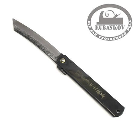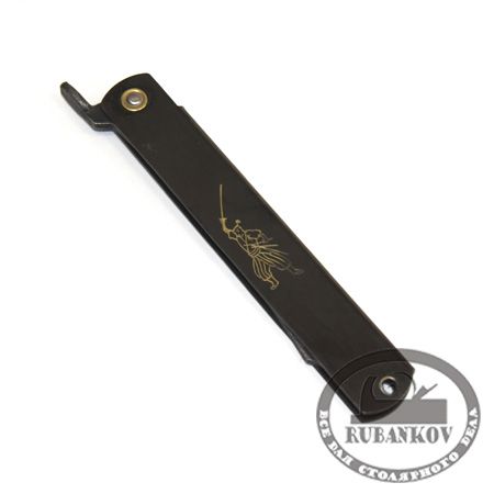 Нож складной. Черная рукоять. Длина лезвия 100 мм, толщина 3 мм. Полная длина 220 мм. Около 20 лет назад почти каждому молодому человеку в Японии принадлежал карманный нож Higonokami. Известный кузнец Мотосьюк Нэгэо все еще делает эти ножи в небольших количествах. Лезвие из трехслойной стали выполнено в форме японского меча и имеет *прибитую поверхность*. Рукоять выполнена из листовой черной гальванизированной стали с золотым рисунком. Нож открывается путем нажатия на рычаг. Производство - Higonokami (Япония).