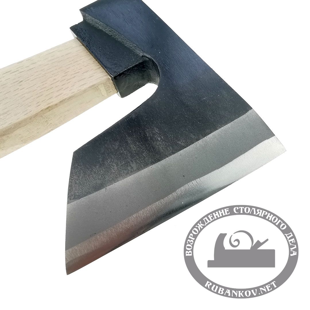 Японский кованный топор из мягкой стали с вставкой режущей части из твердой углеродистой стали (58-60 HRc) Имеют широкую бородку и суженное горлышко, что важно для чистовой обработки древесины. Ширина лезвия 95 мм. Длина топора 330 мм. Масса откова 530 г. Полная масса 730 г.
