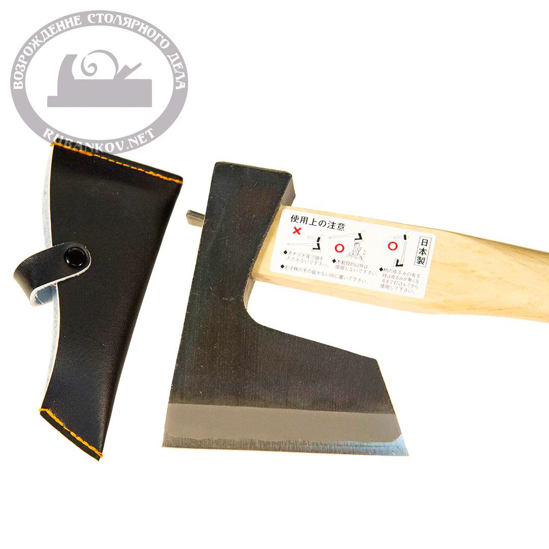 Японский кованный топор со вставкой из углеродистой стали. Основа топора мягкая конструкционная сталь. Твердость вставки 58-60HRC. Двойная фаска не позволит топору застревать, а вынос лезвия не позволит травмировать руки при точных работах. Высота топора - 130мм, ширина лезвия - 105 мм. Масса топора - 0,57кг. Проушина - квадратная. В комплекте защитный чехол. Произведено в Японии
