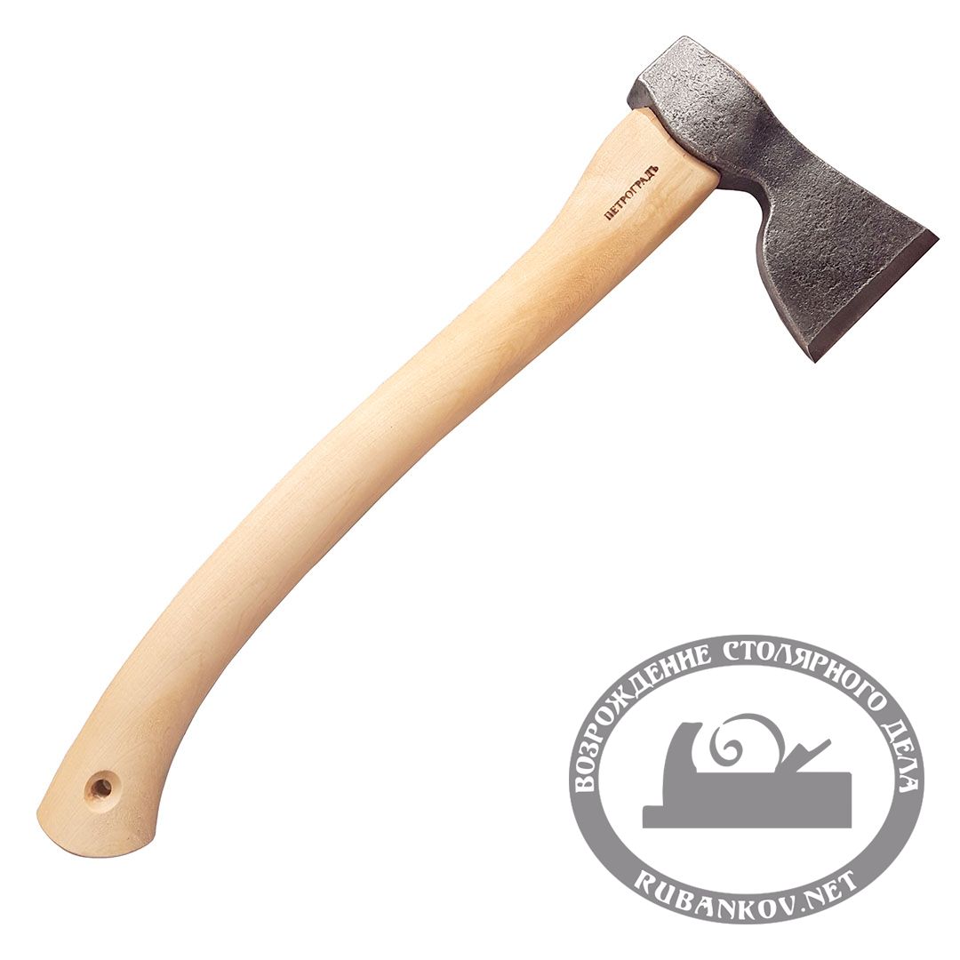 Плотницкий топор. Топор представлен в двух вариантах с прямой и изогнутой рукоятью.Точный инструмент для плотницких работ и работ по дереву. Вырез на топоре позволяет держать его ближе к голове, что очень удобно при точной работе. Обух можно использовать в качестве молотка. Длина режущей кромки 100 мм, длина топора 465 мм. Масса 1000 г. Поставляется с кожаным чехлом. Топор изготовлен из отличной  стали 65Г. Топор подвергается высококачественной закалке и отковке до твердости 58-60 HRc. Отковка в ручную позволяет значительно увеличивать прочность. Рукоять выполнена из прочной древесины клёна и пропитана тунговым маслом для предотвращения гниения.Топор насажен на рукоять с помощью двух деревянных клиньев.  В комплекте чехол для защиты лезвия из натуральной кожи. Производство - фабрика столярных и плотницких инструментов ПЕТРОГРАДЪ.