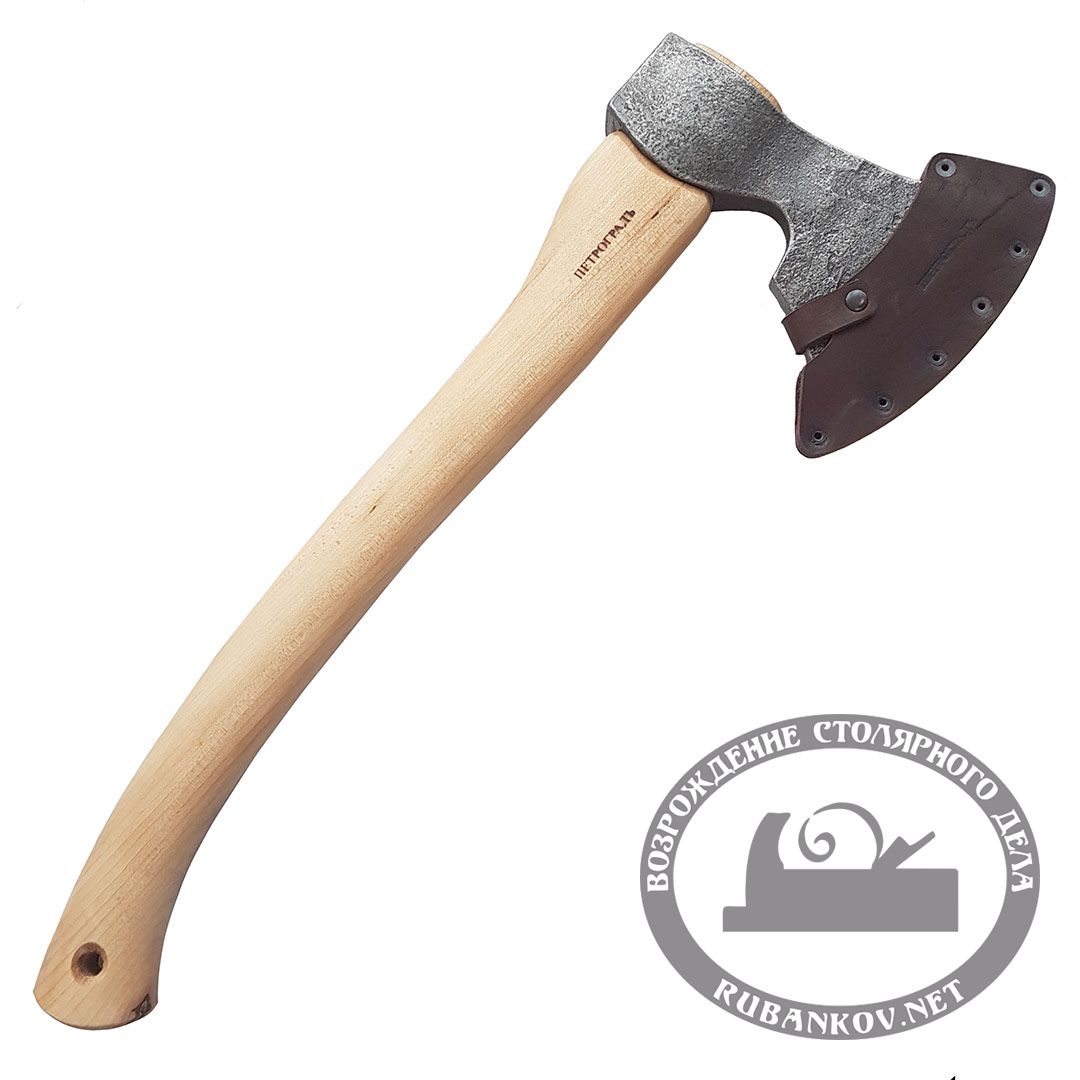 Топор походный. Общая длина - 490 мм. Высота топора - 120 мм. Топор выкован вручную из стали 65Г. Заточка линзообразная. Ударный усиленный обух длиной 45 мм, шириной 25 мм и высотой 16 мм. Общая масса - 1,2кг. В комплекте кожаный чехол для защиты лезвия. Топорище выполнено из древесины клёна, длиной 380 мм. Топор отлично сбалансирован и подойдет для вырубки, обрезки сучьев, забивки клиньев и других походных нужд. В Канаде приверженцы рафтинга и каное строения прозвали данный топор - Canoe Axe. Производство - фабрика столярных и плотницких инструментов ПЕТРОГРАДЪ.