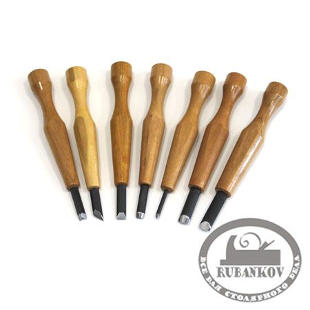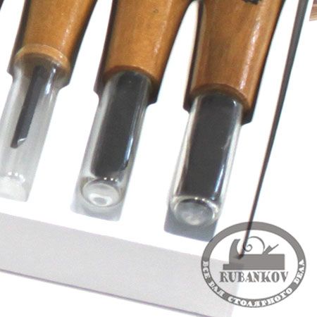 Набор состоит из: плоской стамески шириной 7,5мм, скошенной стамески шириной 7,5мм, полукруглой стамески шириной 7мм, полукруглой стамески шириной 3мм, углового резца шириной 7мм и двух полукруглых стамесок шириной 9,5мм. Полная дина резцов - 150мм, длина полотна - 30мм.