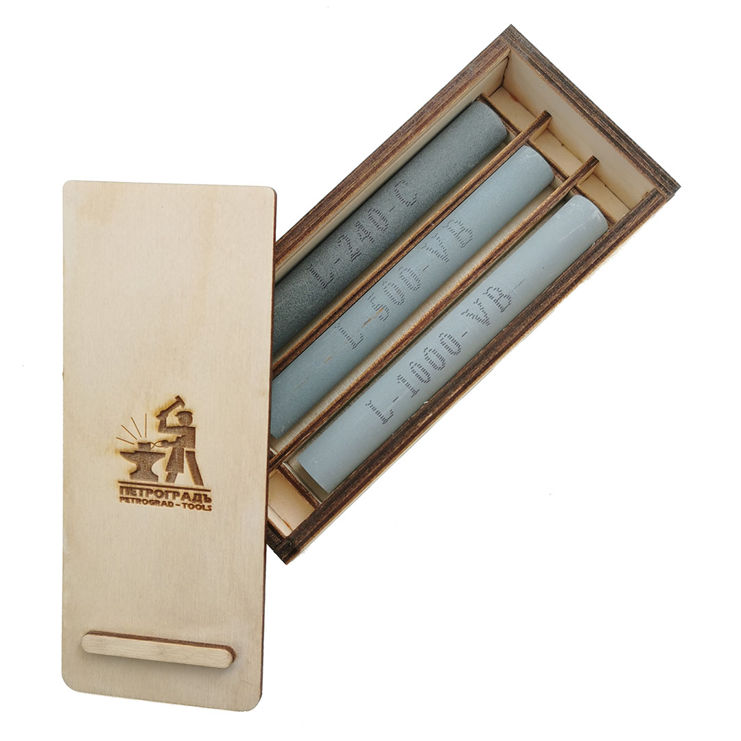 Абразивные водные камни (бруски) цилиндрической формы. Зернистость: 240, 500, 1000,2000. Размер ф15х120мм. Абразивное зерно - карбид кремния. Связка - керамика. Твёрдость I обеспечивает минимальный износ камня при работе. При заточке не перегревается сталь. Не требует использования масла. Перед использованием замочить в воде на 2-10 мин. Используются для заточки и задания скосов.
