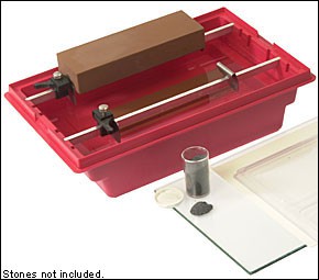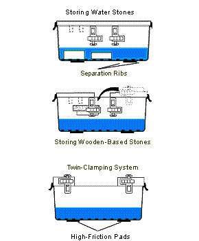 Ванночка для заточки - для удобного хранения и использования японских водных камней длиной до 300 мм. Отличный быстродействующий зажим из нерж. стали для удержания грубых и гладких камней. Камень хранится сухим и чистым, при переворачивании можно замочить камни. В комплект входят накладки против скольжения для ванночки, ламинированный бумажный лист, лист из противоударного стекла с точностью поверхности 0.025 мм на дюйм, сыпучий абразив зернистостью 90 грит. Материал ванночки ABS-пластик. Производство Veritas (Канада).