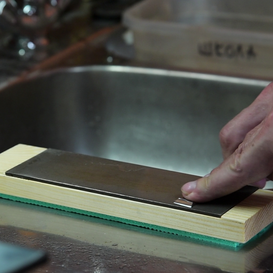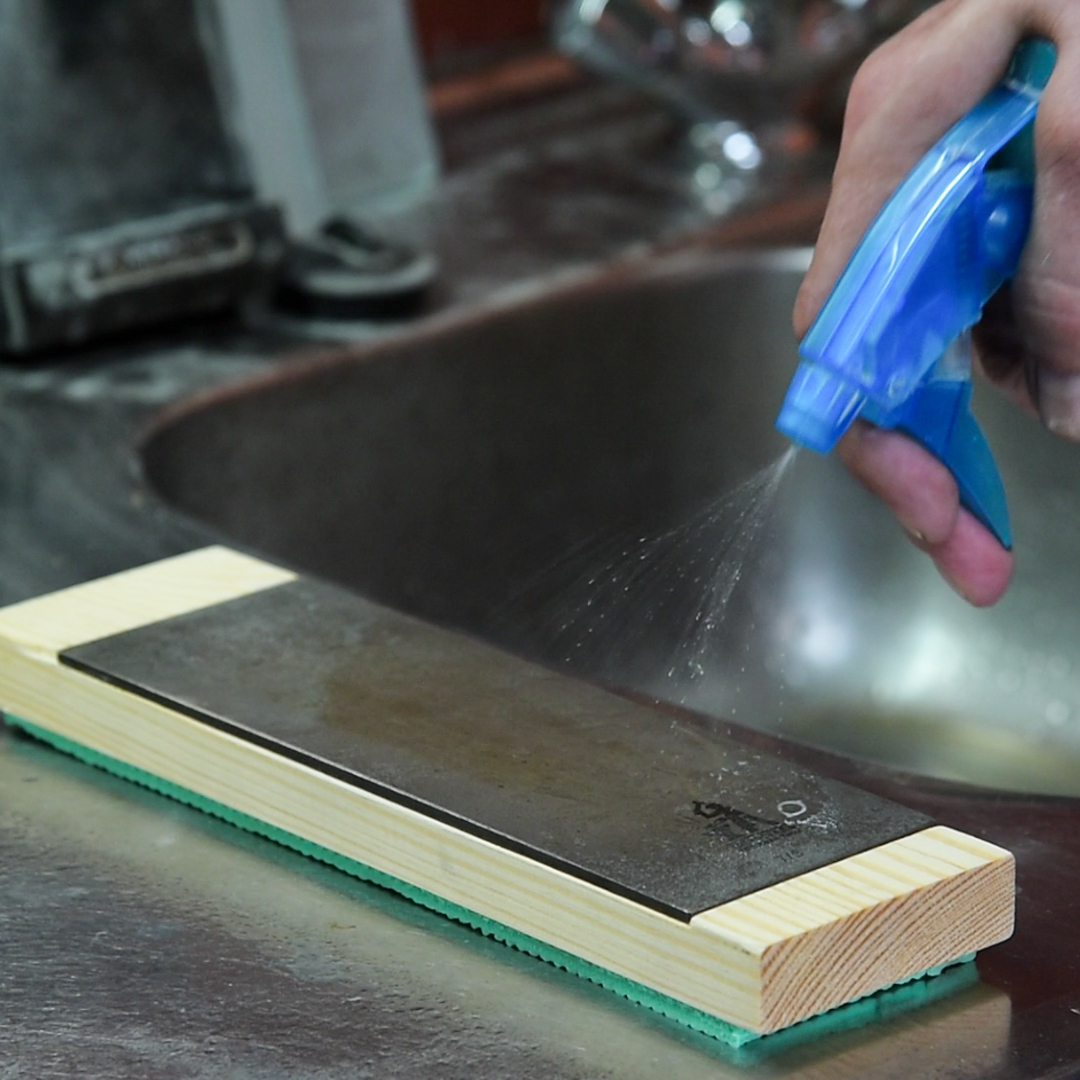 Алмазные бруски нет необходимости замачивать в воде перед использованием, как это необходимо делать с водными абразивами, но работать на алмазных камнях строго рекомендуется с хонинговальным маслом или водой. Алмазные камни являются монолитными шестисторонними брусками, следовательно 6 сторон камня - рабочие. На сегодня выпускаются три различных по агрессивности алмазных камня: 7/5мк (2000грит); 20/14мк (600грит); 40/28ик (300грит)