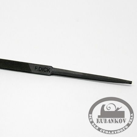 Напильники для затачивания пил. Выпускаются в 3 типоразмерах ширин: 4мм, 5мм, 6мм. Длина рабочей части напильника соответственно: 100мм, 125мм и 150мм. Треугольный профиль с минимальны радиусом на гранях. Насечка - N1. Радиусы на гранях смягчают агрессивность напильника и позволяют уберечь зубья пилы от скалывания во время заточки. Без рукояти. Используется для заточки ручных столярных пил. Производство - Швецария (под маркой Dick).