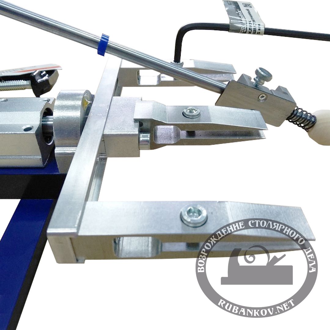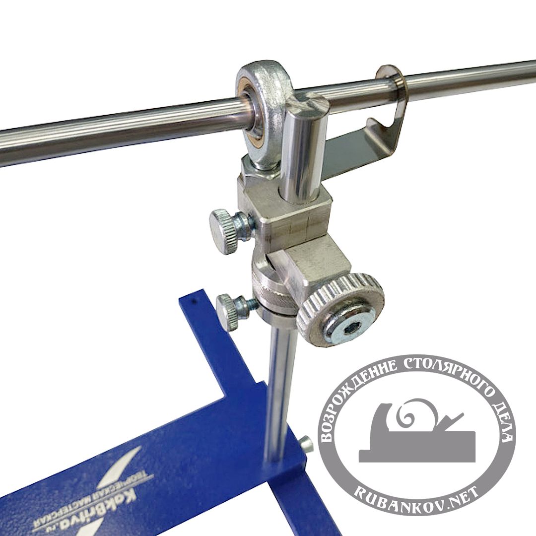 Точная настройка угла производится при помощи перемещаемой по вертикальной штанге системе с подшипником, фиксирующим горизонтальную штангу для абразивов.