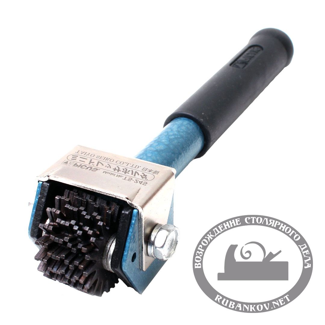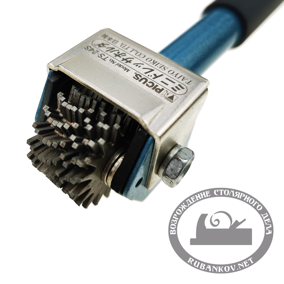 Шарошка TS-24S для более мелких кругов и деликатных работ, например, выравнивания небольших кругов и абразивных насадок для бормашин. Длина - 195мм, Ширина - 45, высота - 37мм. Ширина рабочей части 18мм. Ось на которую устанавливаются шаржирующие звездочки вставляется в специальные шестигранные шайбы. Отверстия в этих шайбах выполняют роль скользящих подшипников. В шайбе 6 отверстий, что значительно увеличивает срок службы инструмента.