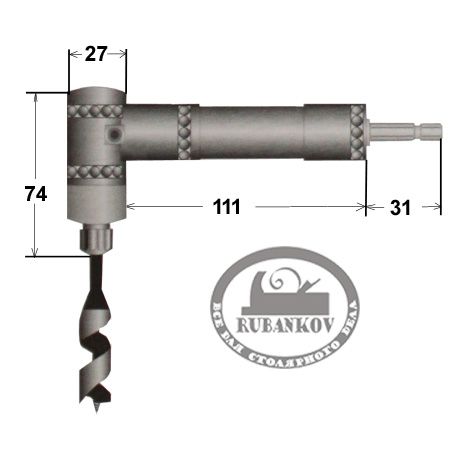 Угловая насадка на дрель. Длина цилиндрической части 111мм что обеспечивает хороший хват насадки. Материал корпуса - алюминий, материал наконечников - хромо-молибденовая сталь. Механическая фиксация хвостовиков бит и сверел. Высокий передаваемый крутящий момент 29,4Н*м позволяет сверлить шнековыми сверлами вплоть до диаметра 21 мм включительно. Шестигранный хвостовик стандарта 6,35мм, длина хвостовика - 31мм. Стандарт зажимаемых бит и сверл - шестигранник 6,35мм. Вес 400гр. Производство - Star-M (Япония).