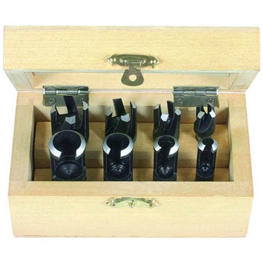 Используются для вырезания деревянных дисков и пробок для заделки отверстий и т.п. в деревянных заготовках. Получаемые пробки плотно сидят в отверстии. Набор включает по четыре цилиндрических и конических сверла из твердой стали в деревянном кейсе. Диаметры сверл: 8, 10, 12, 16 мм с длиной от 10 до 25 мм.