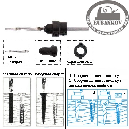 Сверла имеют коническую форму и предназначены для сверления отверстий в древесине под шурупы. Конические отверстия позволяют устанавливать шурупы без зазоров, что повышает прочность соединения (по сравнению с отверстиями полученными с помощью обычных цилиндрических сверл). Наличие на каждом сверле зенкера позволяет спрятать головку шурупа и при необходимости закрыть пробкой. Кроме того на каждом сверле установлены 2 ограничителя - для регулировки глубины сверления и регулировки глубины зенкования. Производство - Star-M (Япония).