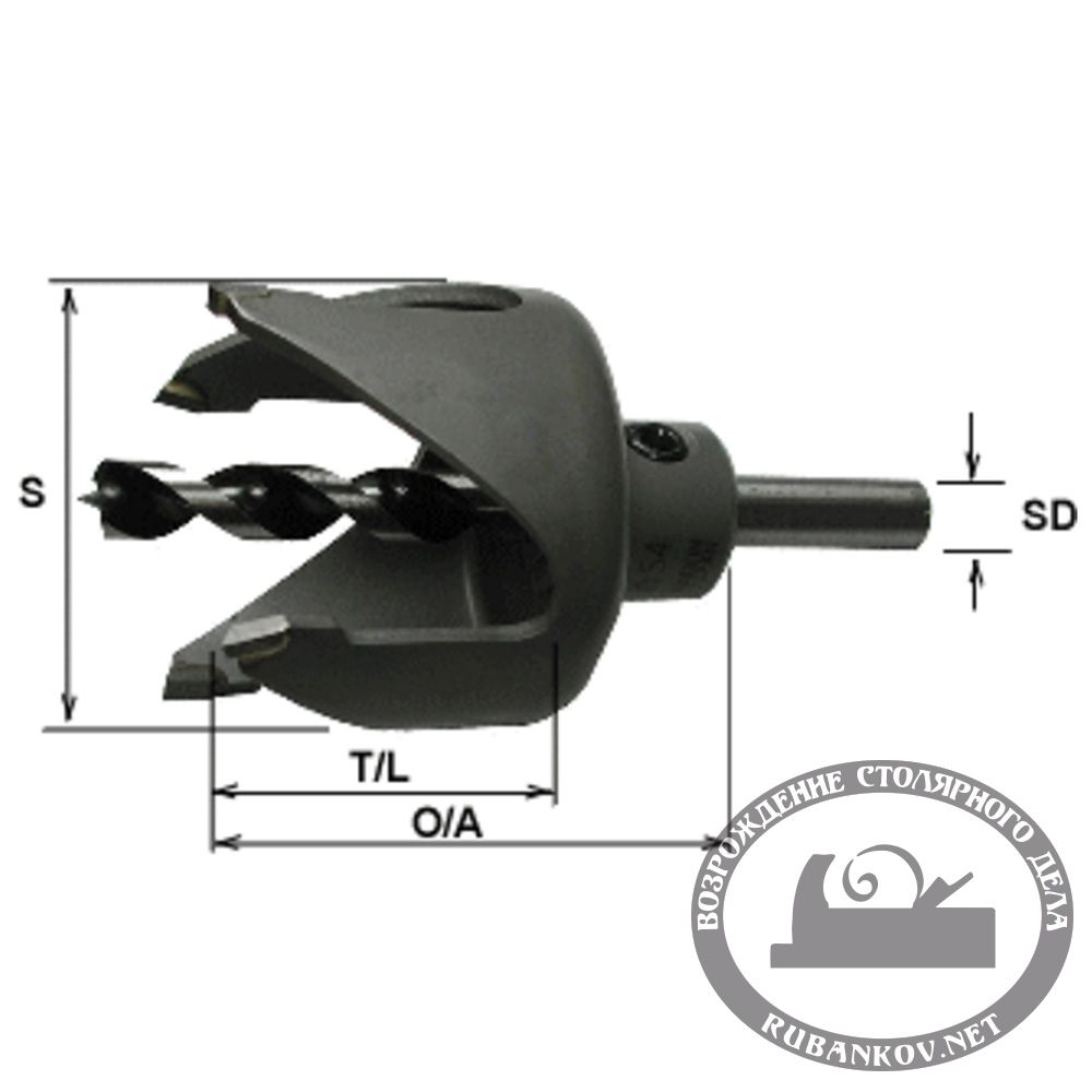 Коронка (кольцевая пила) оснащена твердосплавными напайками и предназначена для сверления крупных отверстий диаметром 54мм в дверных полотнах при установке ручек, в плитных материалах и пр. Коронка имеет направляющее сверло диаметром 9мм. Максимальная глубина сверления 40мм, длина коронки - 60мм, полная длина - 110мм. При возможности доступа к поверхности с двух сторон рекомендуется вначале произвести сверление коронкой на половину глубины материала, после с другой стороны выполнить окончательное сквозное сверление. Максимальная частота вращения - 1500об/мин. Материал - инструментальная сталь. Производство: Star-M (Япония)