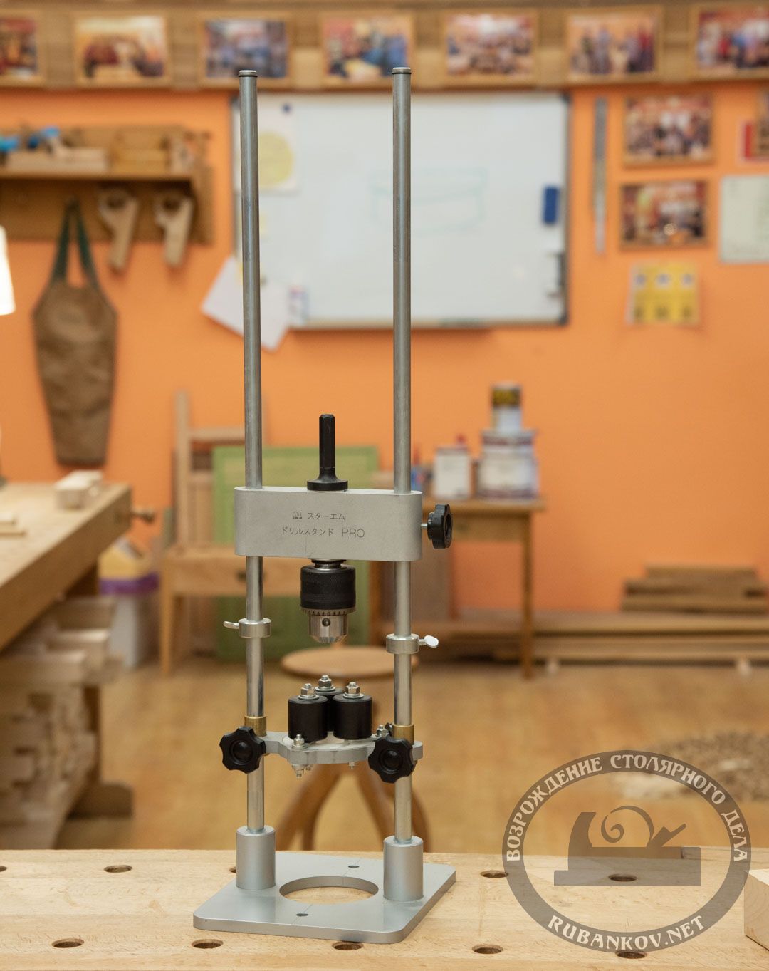 Ни один из деревообрабатывающих сверлильных станков не в состоянии просверлить отверстие длиной до 500мм, не говоря уже о сверлении по месту, куда тащить огромный станок будет весьма затруднительно. Стойка для сверления предназначена для работы с дрелью или мощным шуруповертом и предоставляет возможность сверлить отверстия исключительно под углом 90°. Увеличенное расстояние между штифтами позволяет использовать мощные габаритные дрели.