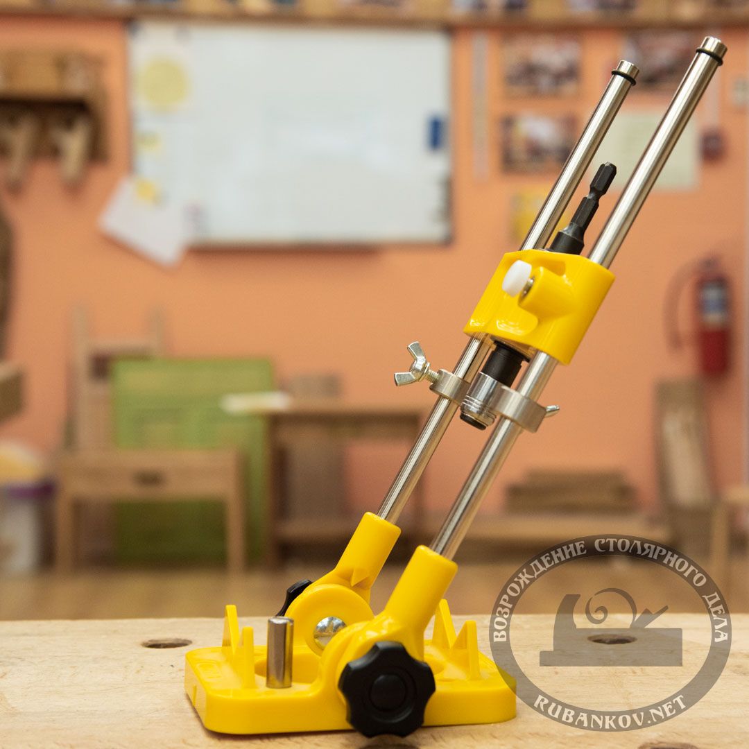 Стойка для шуруповерта или дрели. Стойка снабжена патроном с шестигранным захватом и шестигранным же хвостовиком. Стойка предназначена для вертикального сверления и сверления под заданным углом. Малый вес стойки позволяет использовать ее с руки в горизонтальном положении, например при сверлении отверстий на уже установленной двери.
