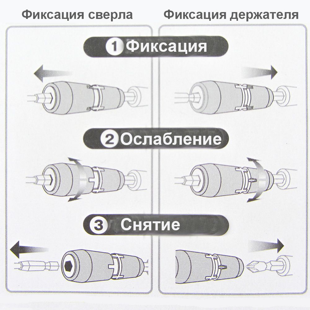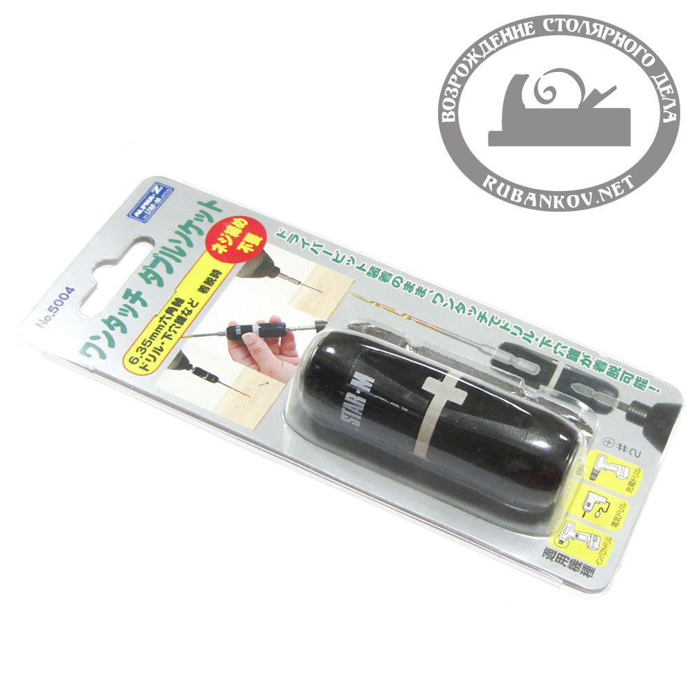 Данный держатель предназначен для быстрого монтажа с помощью шурупов. Он играет роль соединителя то типу патрона Centrotec. Теперь не нужно постоянно переставлять сверло и биту из шуруповерта достаточно снять одним движением сверло и закрутить шуруп. В комплект входит двухсторонняя бита с крестообразным шлицом PH2 длиной 65мм и держатель. Производство - Star-M (Япония)