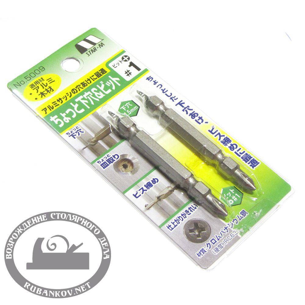 Отверточные насадки модели 5009 производителя STAR-M предназначены для правильного крепления потайными шурупами листового металла без замятия последнего. Одна сторона имеет сверло диаметром 1,5 мм которое сверлит направляющее отверстие для шурупа, а также зенковку. Зенковка получается идеально соосно - Ваш шуруп никогда не уйдет в сторону, а правильный угол зенковки в 90 град. позволяет не заминать металл. Достаточно перевернуть насадку и можно сразу заворачивать шуруп. Выпускаются двух типов: с наконечником PH1 и PH2. В комплекте по 2 шт. Длина насадок 65 мм, длина сверла вместе с зенковкой -8,5 мм. Производство - Star-M (Япония)