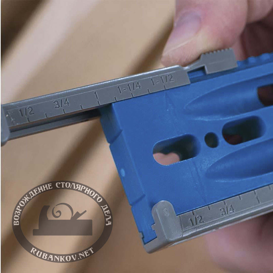 - Специальные ползунки Easy Press обеспечивают установку глубины в одном из 9 положений, позволяя работать с материалом толщиной от ½" (12,7 мм) до 1-½" (38,1 мм) (шаг шкалы ⅛"). Для правильной установки нажмите кнопки по бокам и двигайте слайдеры так, чтобы толщина детали по шкале на слайдерах совпала со стрелкой на приспособлении (показано красным).