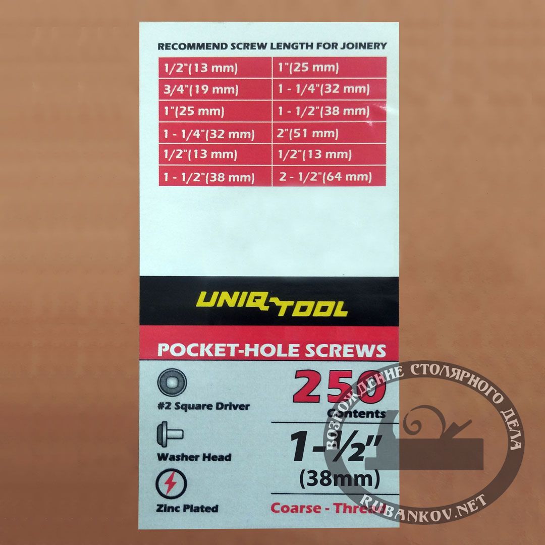 Оцинкованные cаморезы Uniq Tool PAN-Head. Шуруп для систем "на косой шуруп" Kreg являются хорошим выбором для широкого спектра работ. Винты оцинкованы и обладают достаточной защитой от ржавчины и служат доступной альтернативой нержавеющей стали. Шаг резьбы крупный для надежного скрепления мягких пород дерева и фанеры. Саморезы по дереву расфасованы по 200, 250 и 500шт. На острие самореза сделана специальная режущая кромка для первичного засверливания при входе в материал. Предотвращает материал от растрескивания при завинчивании самореза. Шлиц на шляпке самореза имеет квадратную форму под ключ 3х3мм.