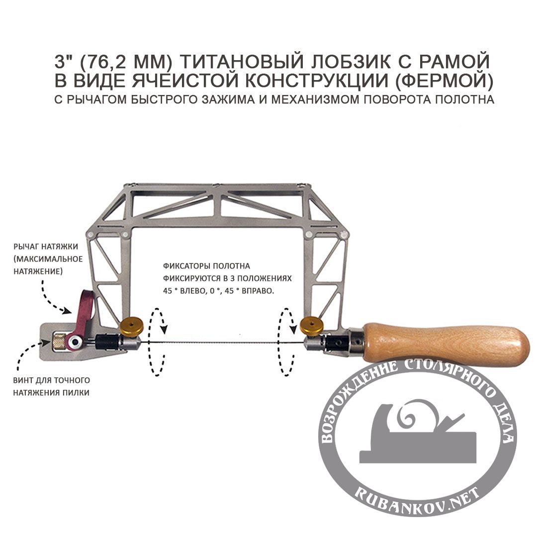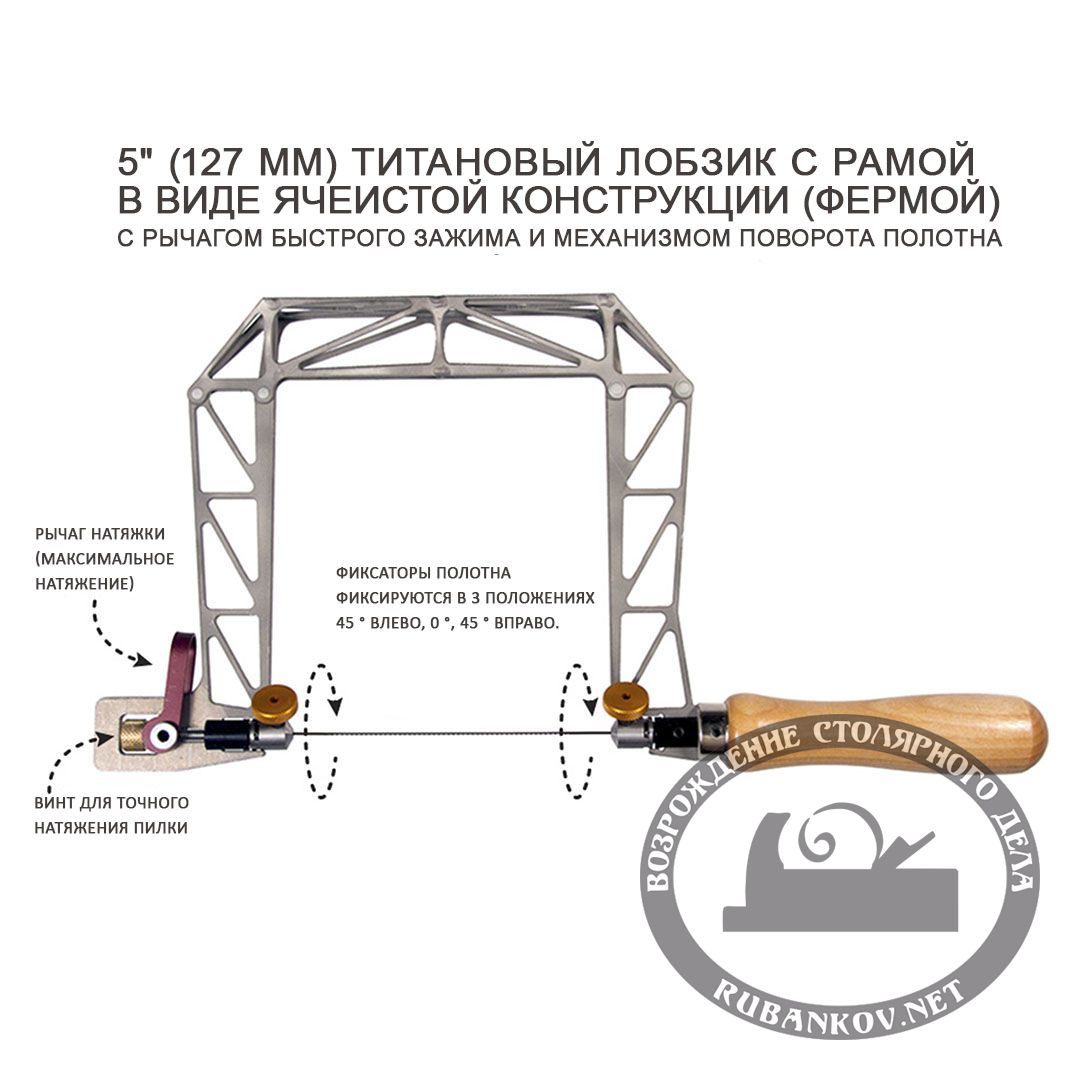 Лобзики ручные Knew Concept Titanium с механизмом поворотом полотна. Длина полотна - 130мм, глубина пила - 75, 125, 200 мм. Самые прочные и жёсткие рамочные лобзики, доступные на рынке сегодня! Это рама в виде фермы выполнена из титана и собрана методом заклепок и точечной сварки. Лобзики оснащены рычагом быстрой натяжки полотен и винтом для точной регулировки натяжения. Натяжения можно довести до состояния, когда полотно начинает «петь». Также есть механизм позволяющий повернуть плоскость реза относительно основной оси лобзика и фиксировать полотно на 45 ° влево, 0 °, 45 ° вправо. Весит всего 7 унций (199 гр.). Поставляется с пилкой. Тестирование этих пил получило высокие оценки среди мастеров ювелиров Америки, создатель этих пил - всемирно известный Ли Маршал (Lee Marshall) изобретатель ювелирного  пресса "Bonny Doon Engineering Hydraulic Press". Производство - Knew Concepts (США)