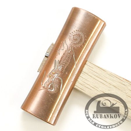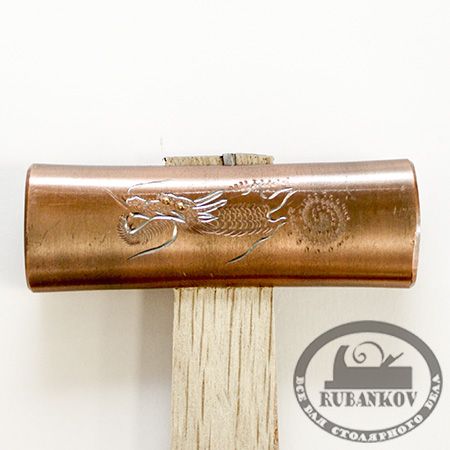 Японский омедненный универсальный 4-х гранный молоток с одним плоским и одним слегка закругленным (для забивки гвоздей заподлицо) бойками, скругленными краями и суженной средней частью. Ударные части закалены до высокой твердости. С 2-х сторон выгравированы вручную мотивы мифических существ.