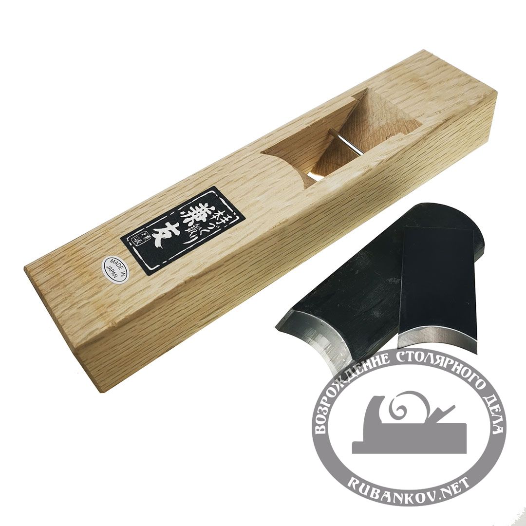Рубанок KANE, Uchimaru, штап, колодка 222*51мм, нож 36мм. Этот рубанок отлично подходит для изготовления рамок и фризов, и скругления углов. Рубанок предназначен для формирования штапа. Колодка выполнена из белого дуба. Лезвие толщиной 4мм из двухслойной стали с режущим слоем твердостью 62-64 HRc и основным слоем из более мягкой стали 50-55 HRc. Для более чистого строгания рубанок оснащен двойным ножом со стружколомом. Нож и стружколом имеют поднутрение для более быстрой доводки, как на японских стамесках. Это один из немогих галтельгых рубанков, которые имеют стружколом. Сталь ножа — высокопрочная оружейная сталь Japanese Sword Still. Перед началом работы рубанок необходимо довести нож и колодку, и отрегулировать его. Рубанок из упаковки заточен, но не готов к работе. Традиционно для японского инструмента строгание производится на себя. Длина рубанка 222 мм, ширина - 51 мм, высота колодки - 36мм. Ширина ножа — 36мм. Масса 340 г. Производство Япония.