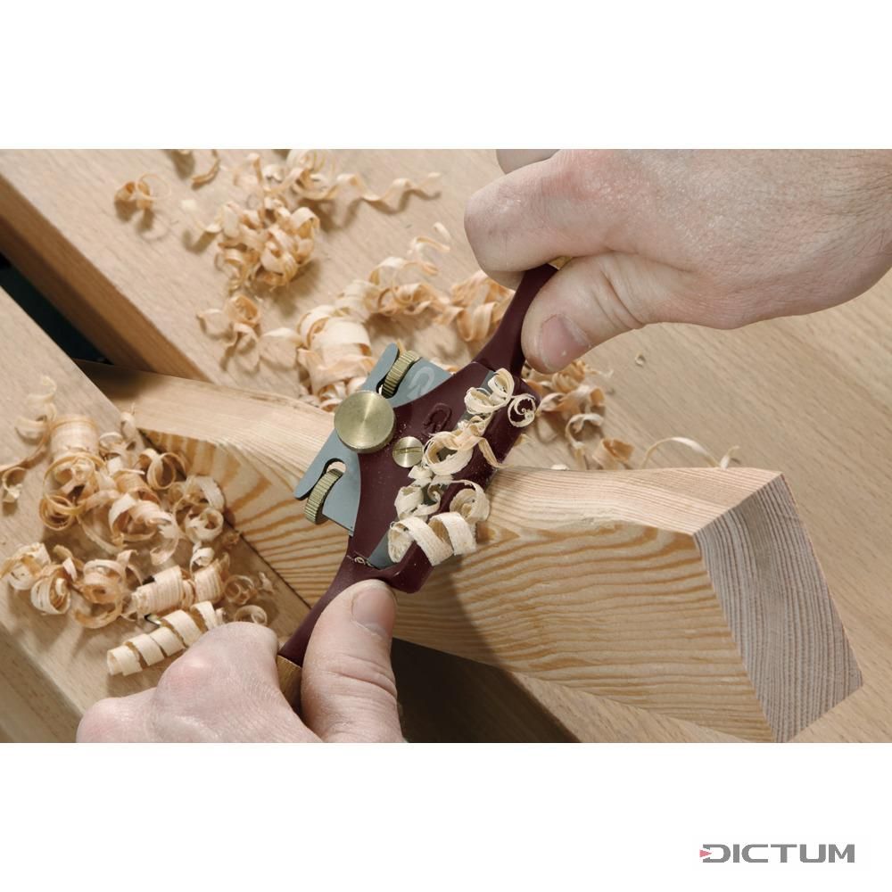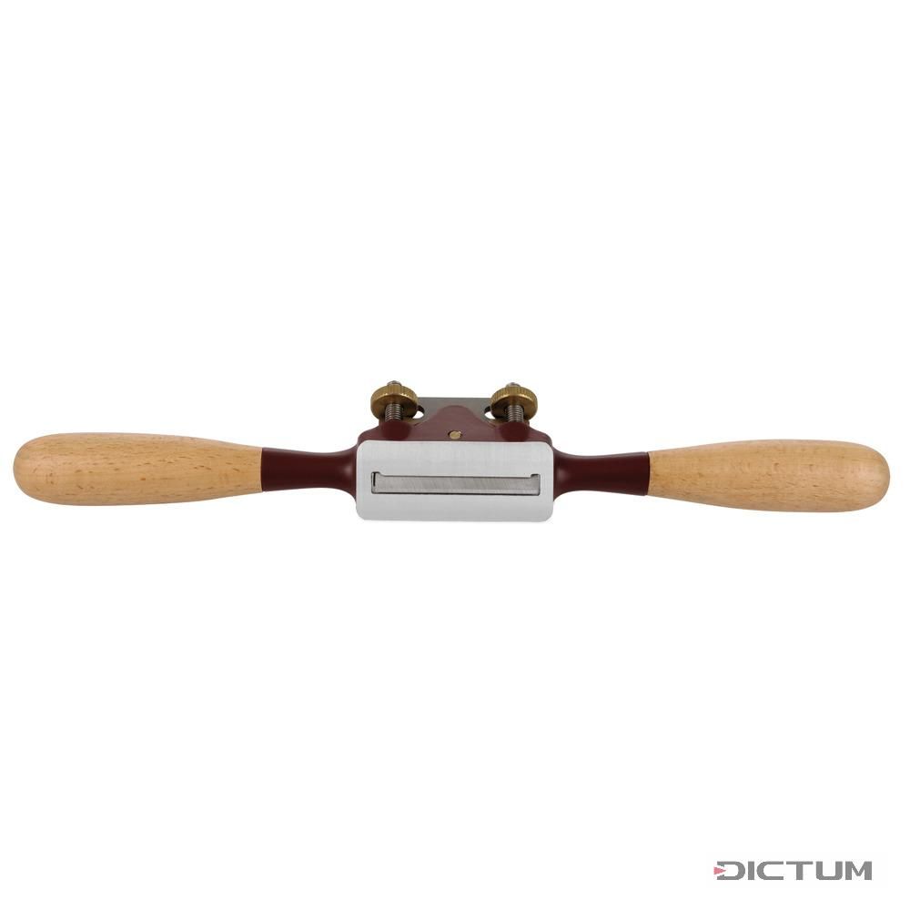 Стружок с плоской колодкой, отлитой из стали. Длина стружка - 280мм, масса - 320г. Нож из высокоуглеродистой инструментальной стали SK-4 (Состав: C 0.90-1.00%, Si ≤0.35%, Mn ≤0.50%, P ≤0.03%, S ≤0.03%, Cr ≤0.20%, Ni ≤0.25%, Cu ≤0.30%) толщиной - 3.0 мм, шириной -50мм. Положение ножа регулируется с помощью 2-х винтов, что дает раскрытие ротка до 0.5-0.8мм. Нижняя часть зажима ножа скошена под углом, для лучшего отвода стружки. Рукояти из бука. Материал винтов - латунь. Предназначен для строгания поверхностей изогнутых и округлых форм. Производство - Тайвань (под маркой Dick)