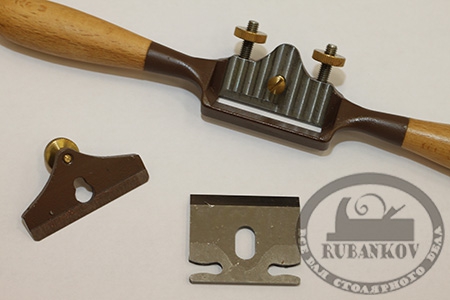 Стружок с полукруглой колодкой, отлитой из стали. Радиус подошвы - 40мм, длина - 280мм, масса - 320г. Нож из высокоуглеродистой инструментальной стали SK-4 (Состав: C 0.90-1.00%, Si ≤0.35%, Mn ≤0.50%, P ≤0.03%, S ≤0.03%, Cr ≤0.20%, Ni ≤0.25%, Cu ≤0.30%) толщиной - 3.0 мм, шириной -50мм. Положение ножа регулируется с помощью 2-х винтов, что дает раскрытие ротка до 0.5-0.8мм. Нижняя часть зажима ножа скошена под углом, для лучшего отвода стружки. Рукояти из бука. Материал винтов - латунь. Предназначен для строгания поверхностей изогнутых и округлых форм. Производство Тайвань (под маркой Dick)