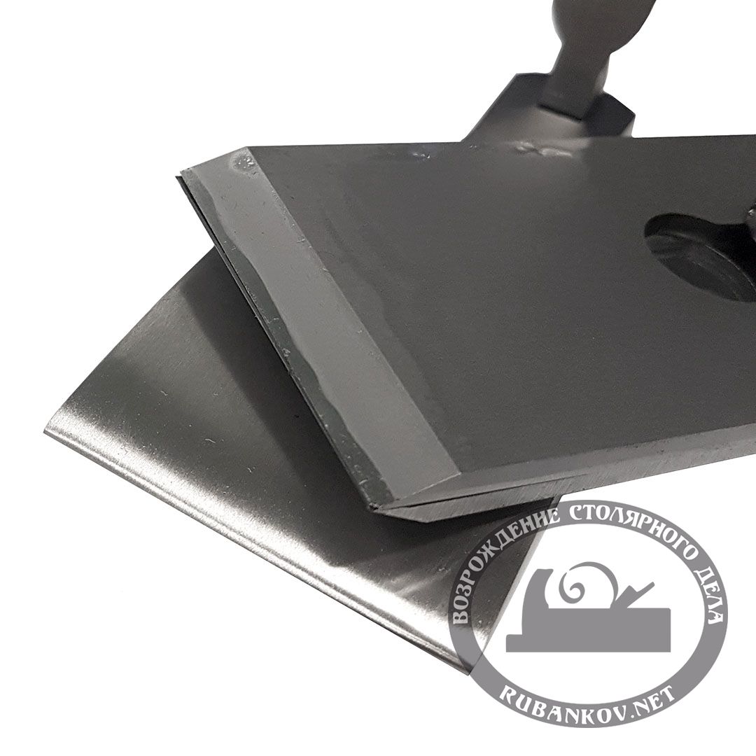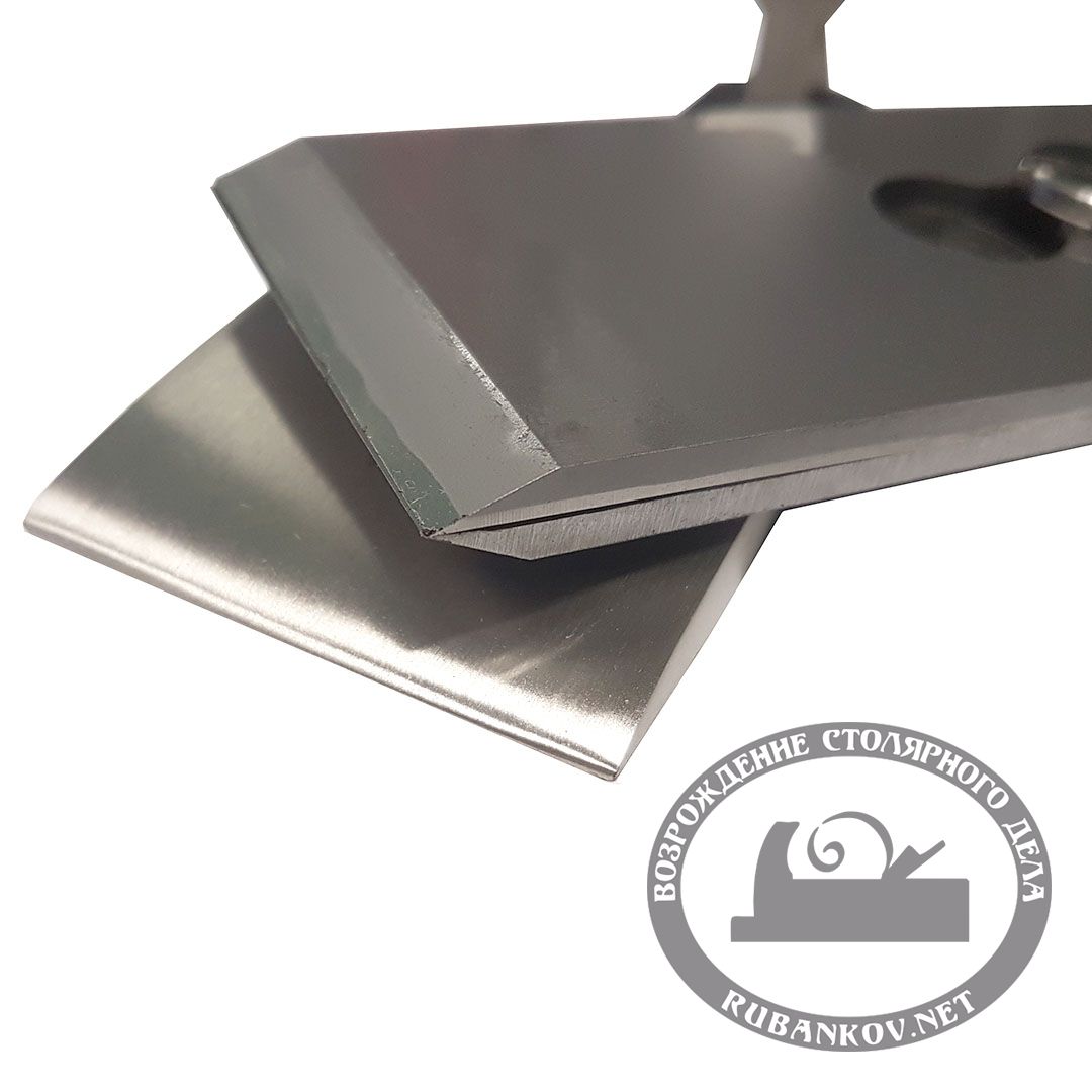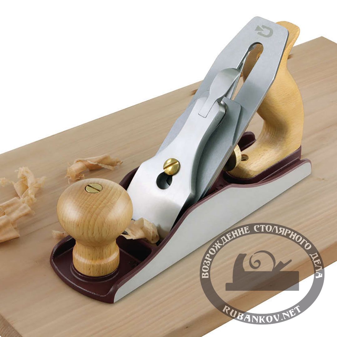 Рубанок для чистового строгания скопированный с рубанка №4 Stanley серии Bedrock. Колодка отлита из стали с хорошо отполированной подошвой. Нож выполнен из с японской стали "голубая бумага" с твердостью (63 HRC) , ширина 51 мм, толщина 3 мм, снабжен стружколомом. Угол установки 45 градусов. Рубанок оснащен механизмом регулировки лягушки, благодаря чему можно изменять ширину ротка без изменения настроек ножа. Также снабжен механизмом плавной регулировки вылета ножа. Массивные рукояти из бука удобны в работе даже для людей с большими руками. Винты и гайки выполнены из латуни. Длина рубанка - 250мм. Масса - 2250г.