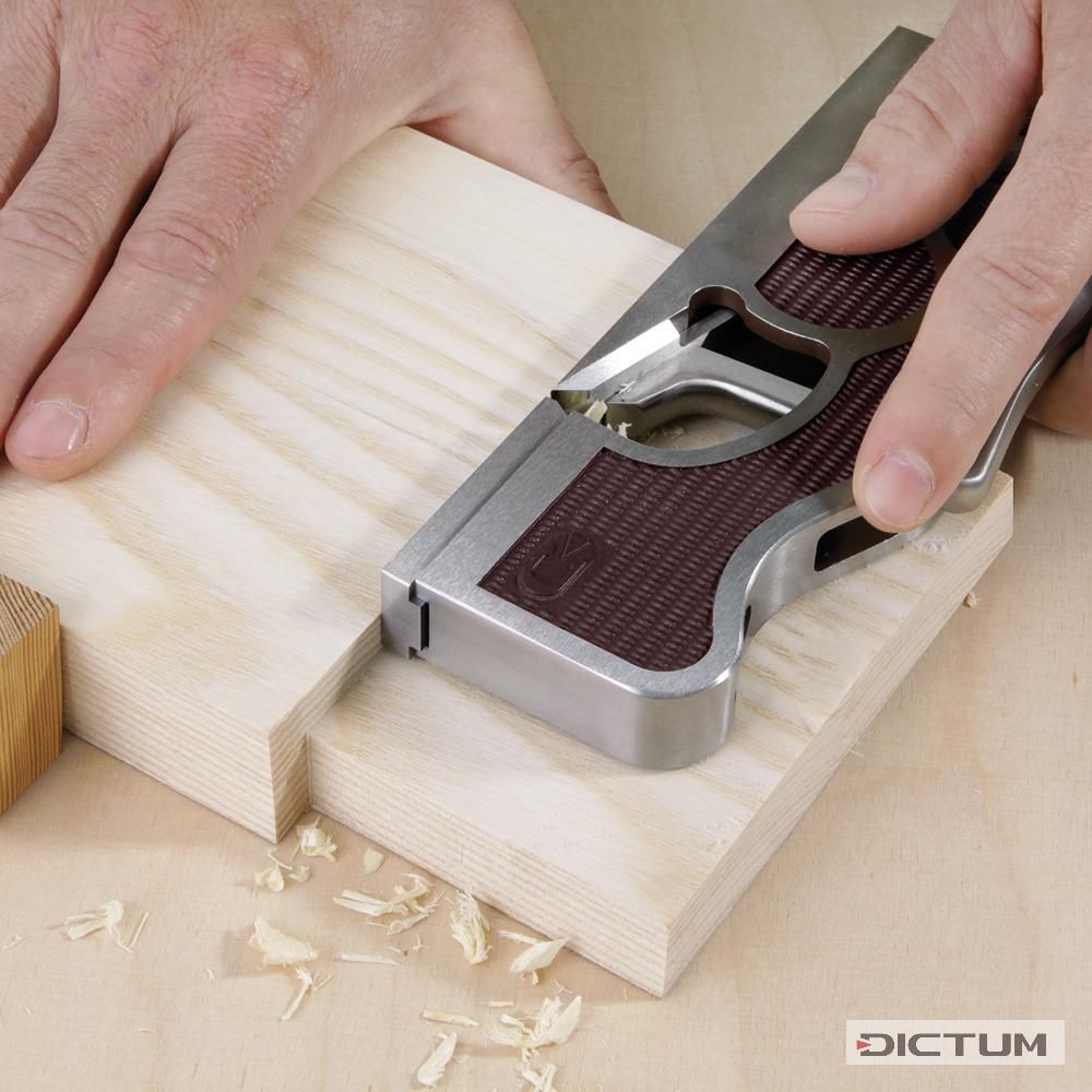 Рубанок-зензубель Dick. Общая длина - 235мм, длина колодки - 175мм, ширина - 19мм, масса - 980г. Ширина ножа - 19мм, толщина - 3.2мм. Колодка отлита из стали. Нож выполнен из высокоуглеродистой стали SK-4, твердость - 62HRc (Состав: C 0.90-1.00%, Si ≤0.35%, Mn ≤0.50%, P ≤0.03%, S ≤0.03%, Cr ≤0.20%, Ni ≤0.25%, Cu ≤0.30%). Изменяемая ширина ротка. Поверхность колодка рубанка точно шлифована и образует угол в 90º, что в купе с размером и массой рубанка позволяет легко обрабатывать шипы и выбирать четверти. На боковую поверхность колодки зензубеля нанесены засечки, что позволяет избежать скольжения руки при работе рубанком на боку. Производство - Тайвань (под маркой Dick)