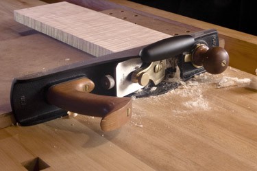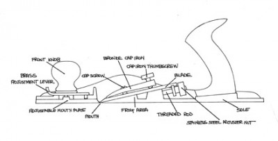 Лезвие: Выполнено из инструментальной легированной стали А2, имеет твердость 60-62 HRc. Ширина 50.8 мм. Проходит двойную закалку, что позволяет лезвию долго держать заточку. После закалки лезвие шлифуется со всех сторон практически до состояния зеркала. Массивное лезвие, толщиной4.8мм обеспечивает точный рез без болтовни. Прижим лезвия выполнен из латунной бронзы. Для лучшего реза рекомендуется сделать на лезвии микроскос под углом 5°.