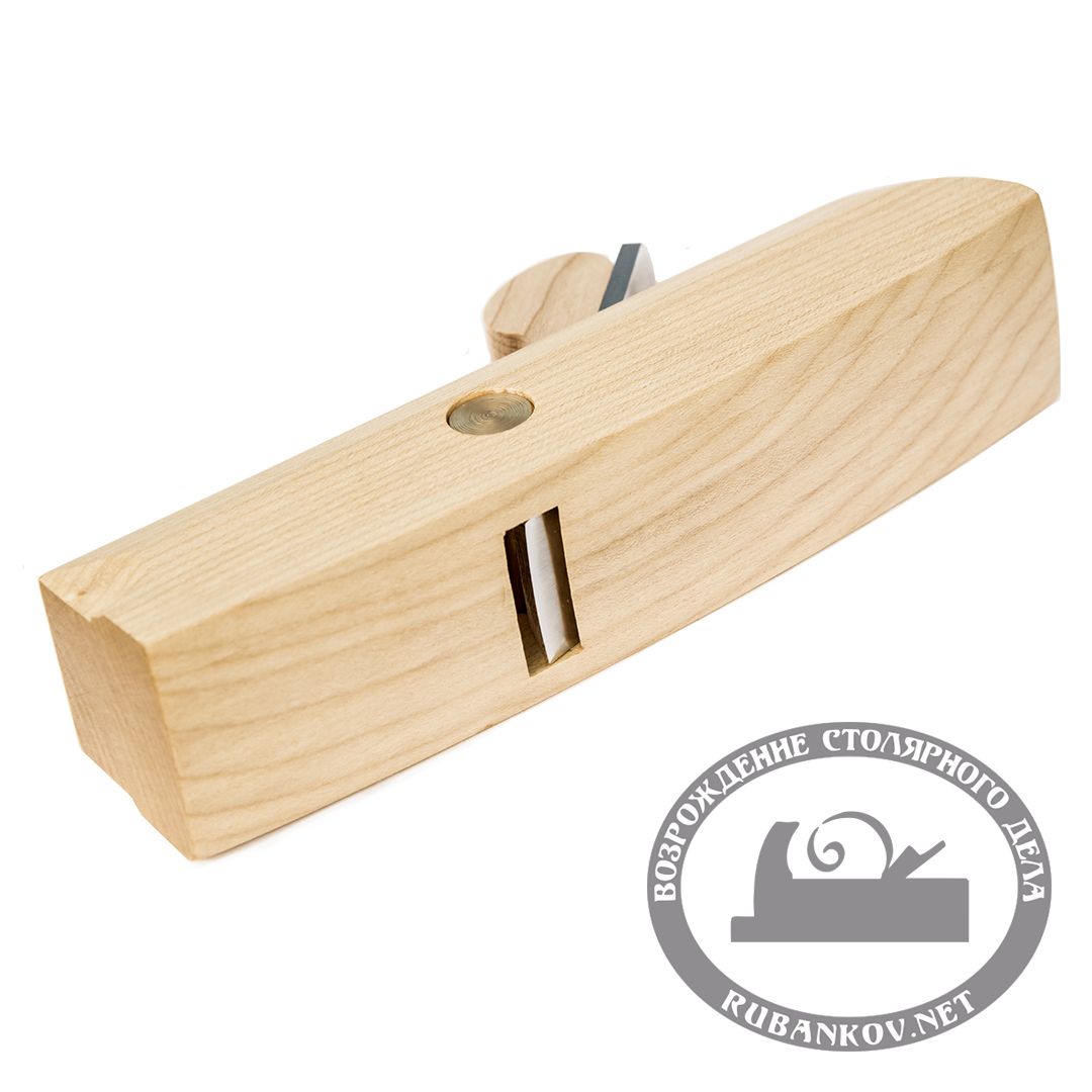 Рубанок-горбач ПЕТРОГРАДЪ, полукруглая РК. Колодка рубанка выполнена из клёна имеет вставку из латуни для надежной фиксации ножа. Покрыт грунтовочным маслом - в один слой и вторым слоем покрыто маслом и воском. Клин также изготовлен из клёна. Нож выполнен из легированной инструментальной стали 9ХС твердостью 59-61 HRC. Угол установки ножа - 45°. Размеры ножа: длина - 110 мм, ширина - 30 мм, радиус режущей кромки ножа 50 мм. Угол заточки ножа 30°. Рубанок предназначен для выборки криволинейных поверхностей, а также для создания декоративных поверхностей.