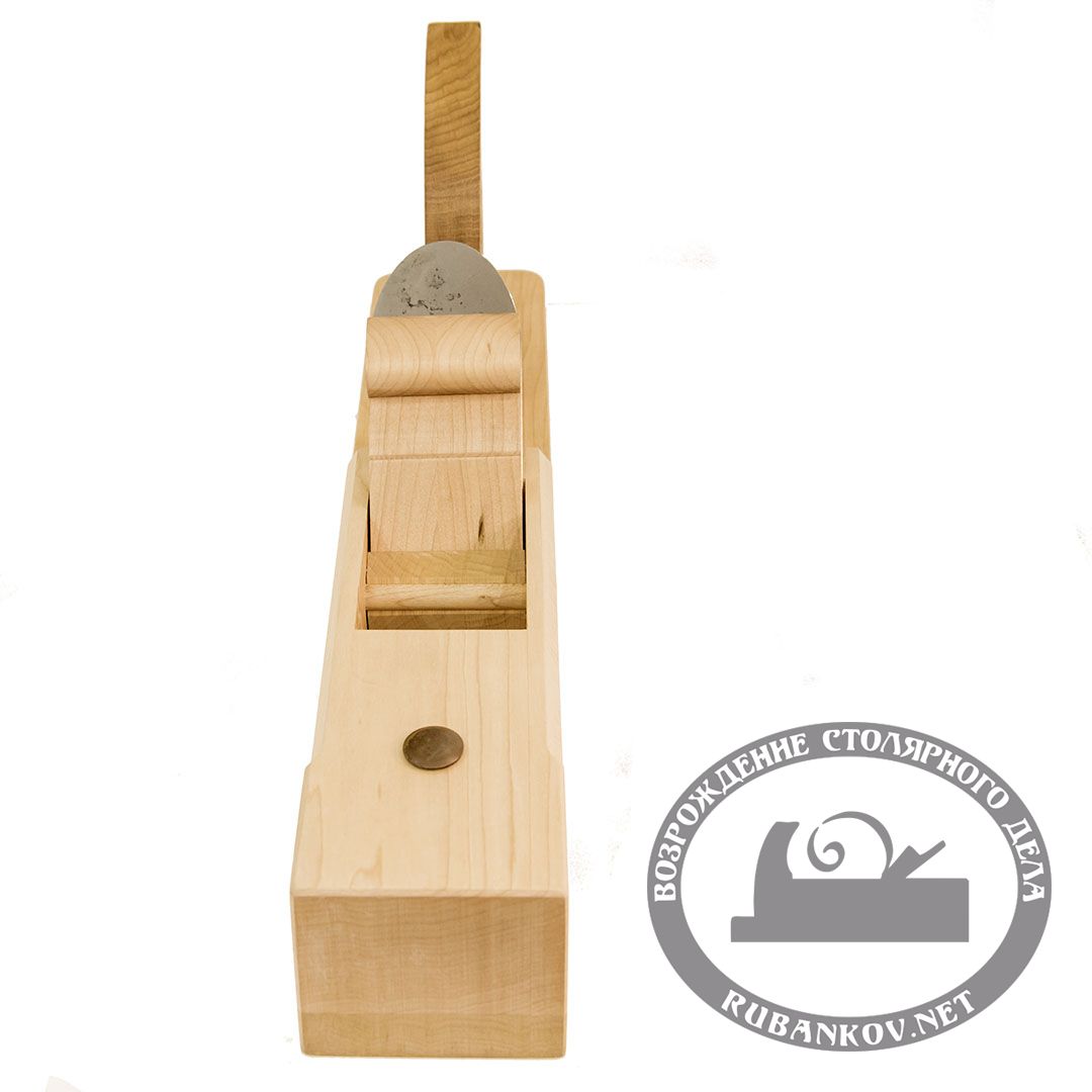 Традиционный деревянный Фуганок. Колодка рубанка выполнена из клёна, подошва - из граба, рукоять - из дуба. Покрыт грунтовочным маслом - в один слой и вторым слоем покрыто маслом и воском. Клин также изготовлен из клёна. Угол установки ножа - 50°. Нож выполнен из легированной инструментальной стали 9ХС твердостью 59-61 HRC. Угол заточки ножа 30°.
