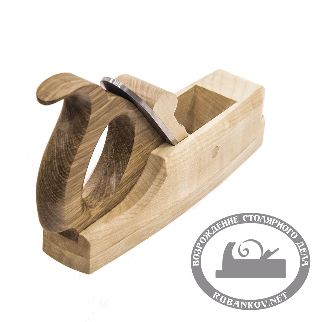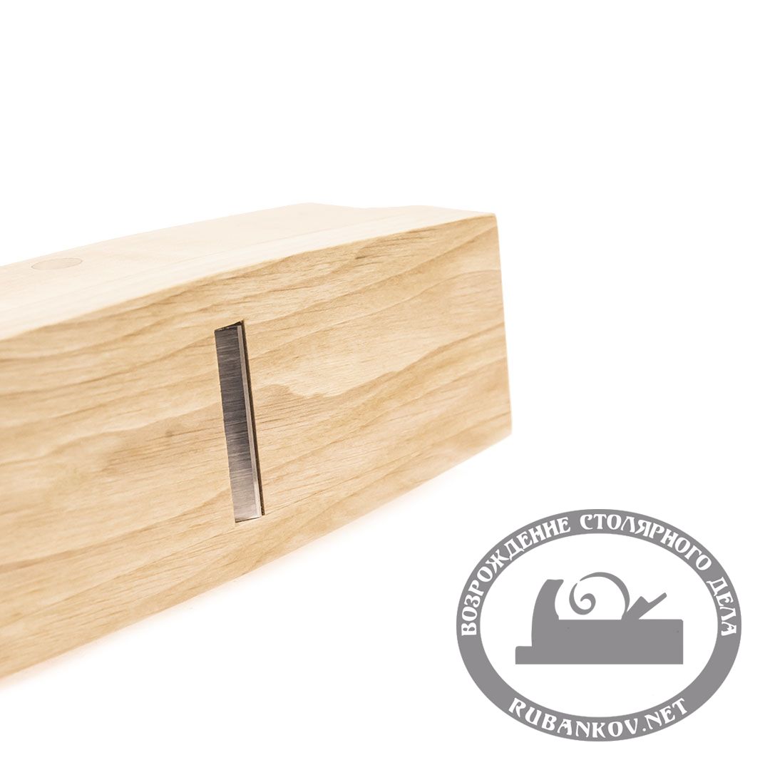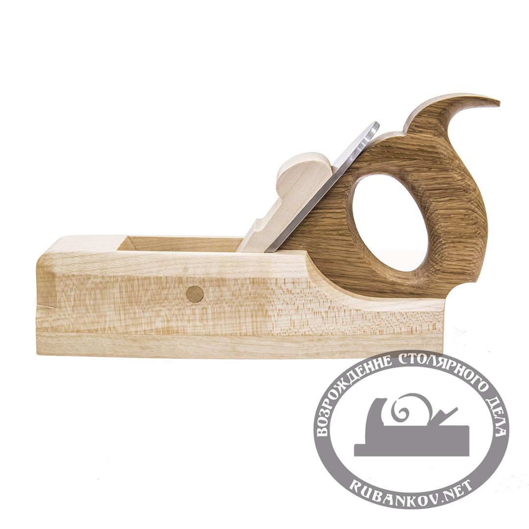 Традиционный деревянный рубанок. Колодка рубанка выполнена из клёна, подошва - из граба, ручка из дуба. Покрыта грунтовочным маслом - в один слой и вторым слоем покрыто маслом и воском. Клин также изготовлен из клёна. Нож выполнен из легированной инструментальной стали 9ХС твердостью 59-61 HRC. Угол установки ножа - 50°. Размеры ножа: длина - 175 мм, ширина - 40 мм, Угол заточки ножа 30° Сделано в России.