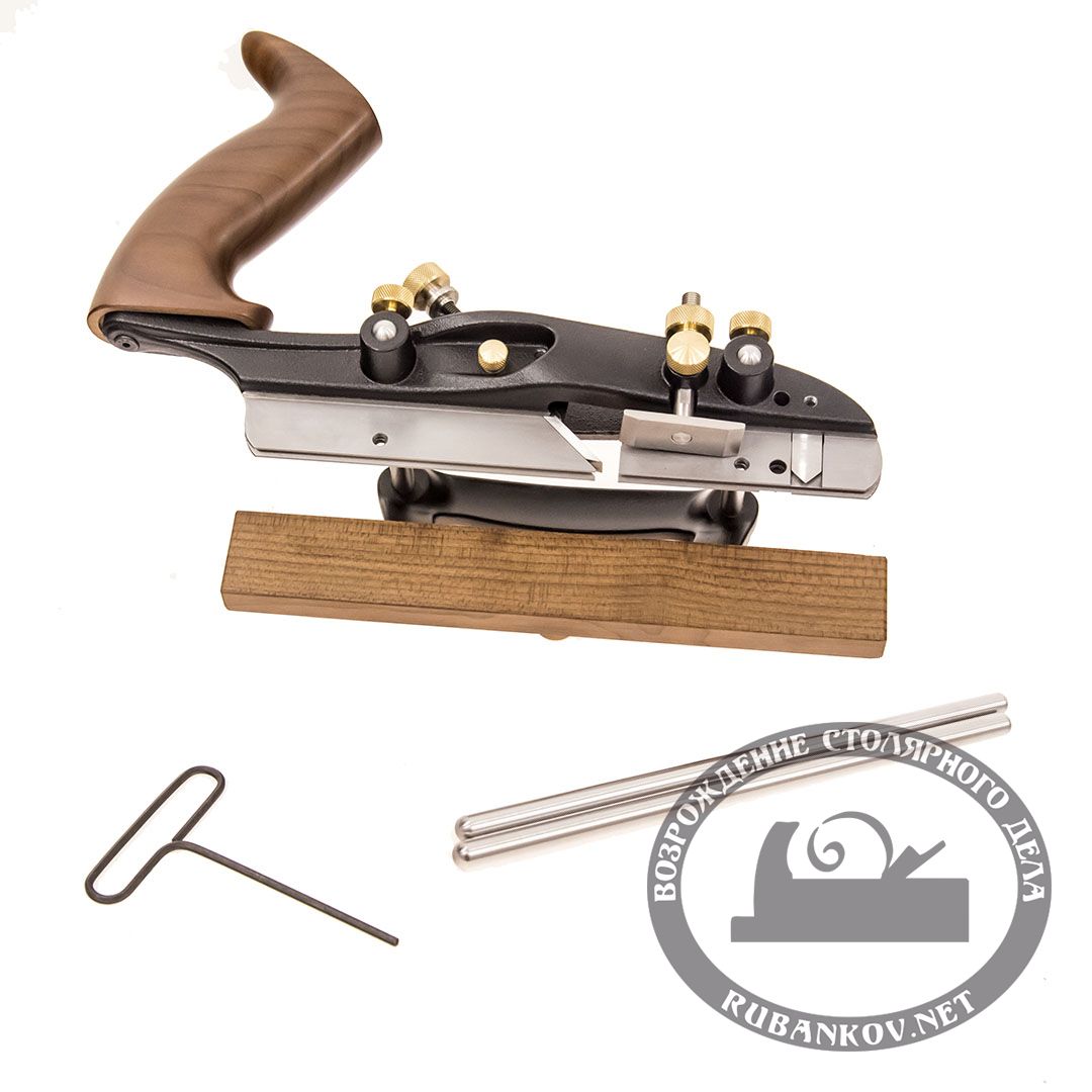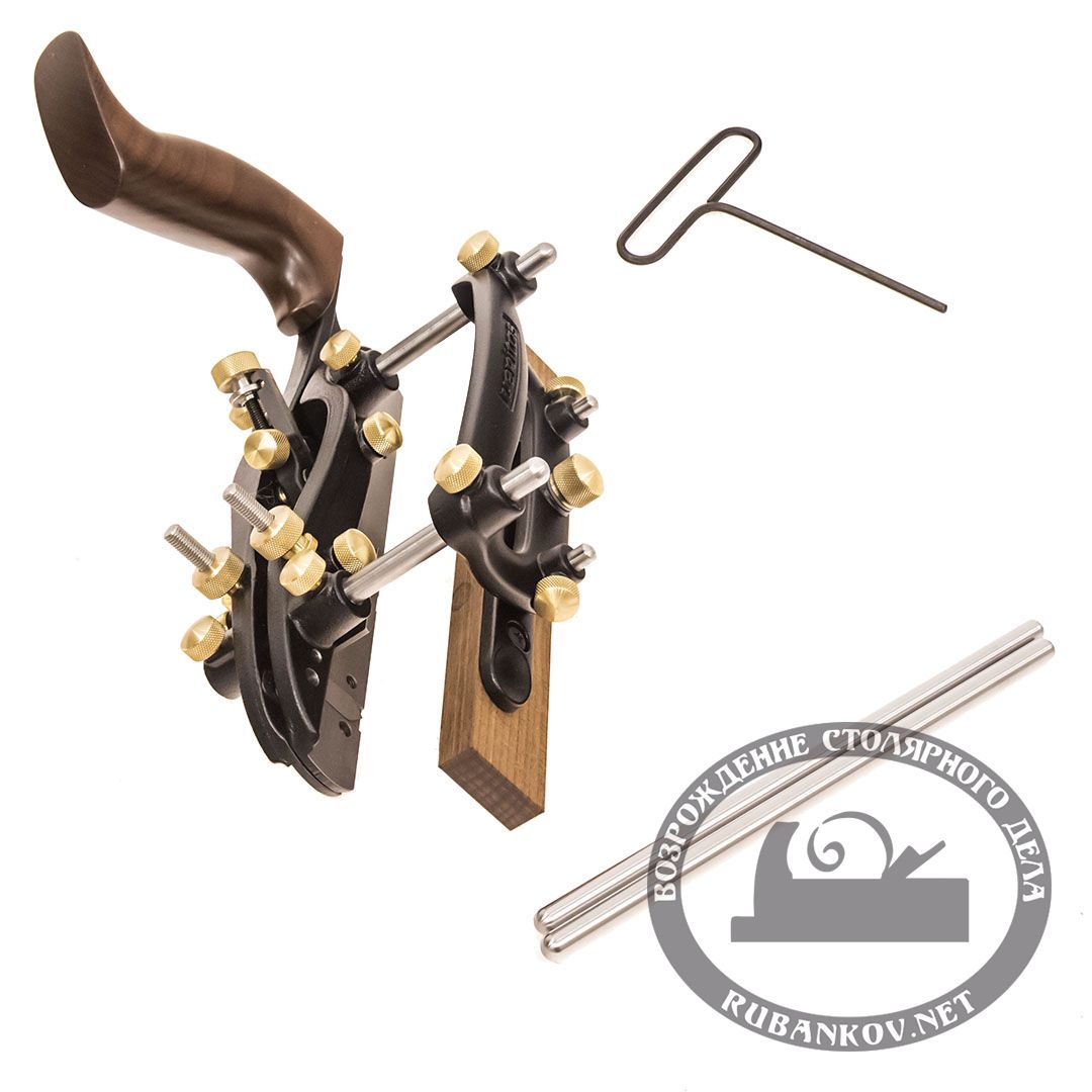 Двойная колодка (основной корпус и подвижная секция) позволяют нам надёжно устанавливать ножи шириной от 3 мм до 27 мм. Для предотвращения вырыва волокон с обеих сторон от паза мы имеем возможность выпускать из колодки вертикальные ножи. Для ограничения глубины строгания предусмотрены два вертикальных упора с дополнительными фиксаторами на каждом. Подвижная секция колодки закрепляется на стержнях, которые одновременно удерживают скользящий горизонтальный упор. Стержни выполнены из нержавеющей стали, в комплекте есть две пары стержней длиной 127 мм (5") и 203 мм (10"). Стержни могут выходить из корпуса колодки и слева и справа, тем самым давая возможность позиционировать рубанок справа или слева от заготовки, учитывая направление волокон или удобное для работы положение рук.