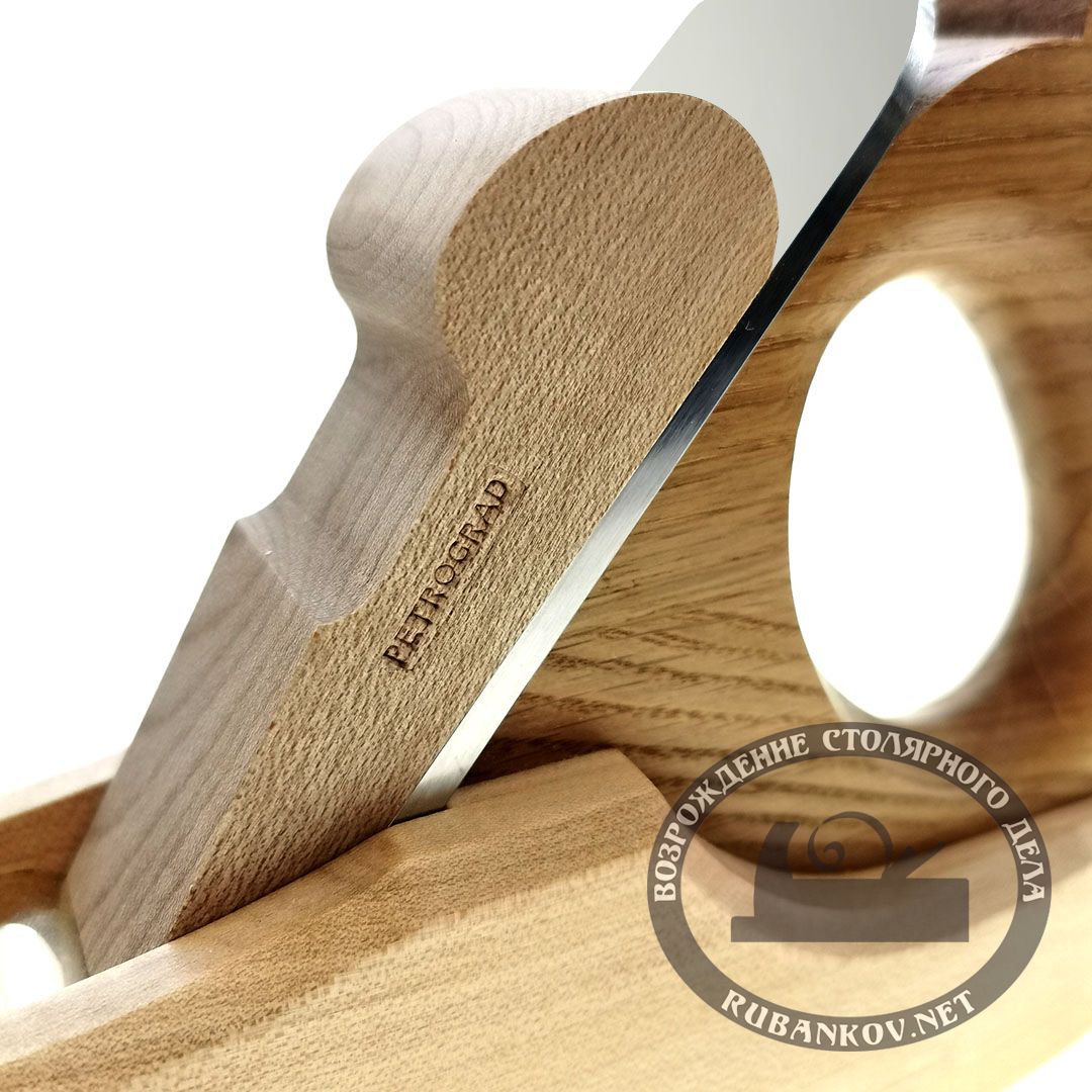 Шерхебель ПЕТРОГРАДЪ используется для чернового строгания со съёмом большого количества древесины. Шерхебель имеет нож с закругленной режущей кромкой. Колодка шерхебеля выполнена из клёна, подошва - из граба. Покрыт грунтовочным маслом - в один слой и вторым слоем покрыто маслом и воском. Длина колодки - 250мм. Клин также изготовлен из клёна. Нож выполнен из легированной инструментальной стали 9ХС твердостью 59-61HRC. Угол установки ножа - 50град. Размеры ножа: длина - 175мм, ширина - 30мм. Угол заточки ножа 30град.