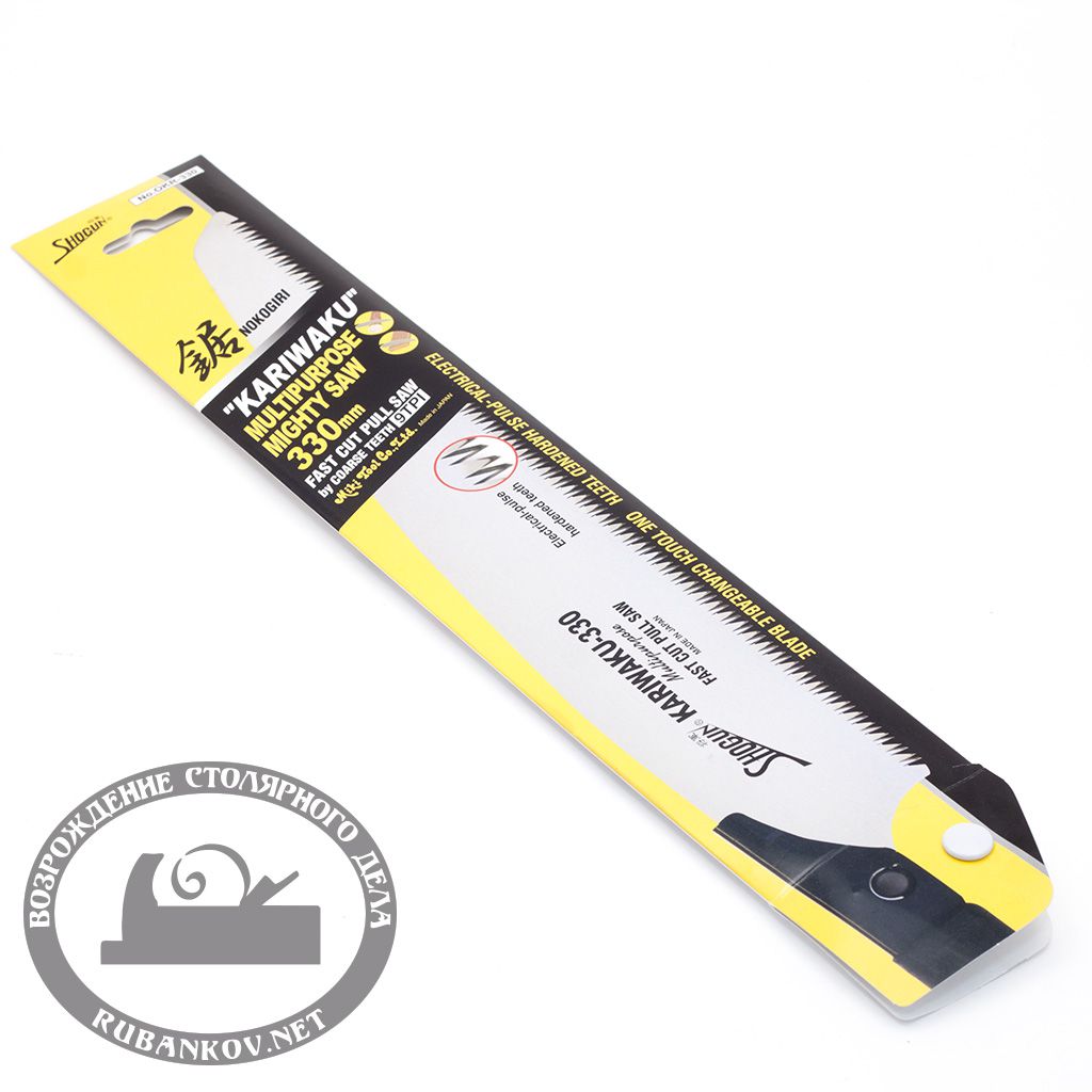 Пила безобушковая Shogun Kariwaku Saw. Длина полотна - 330мм, толщина полотна - 0.9мм, ширина - 55мм, толщина пропила 1,4 мм. Общая длина пилы - 700мм. Трапециевидный зуб (шаг 2.72мм). Хорошо пилит волокна по диагонали, а также сырую древесину, фанеру, ламинат. Легкая алюминиевая рукоять покрытая резиной. Производство Miki Tool (Япония).