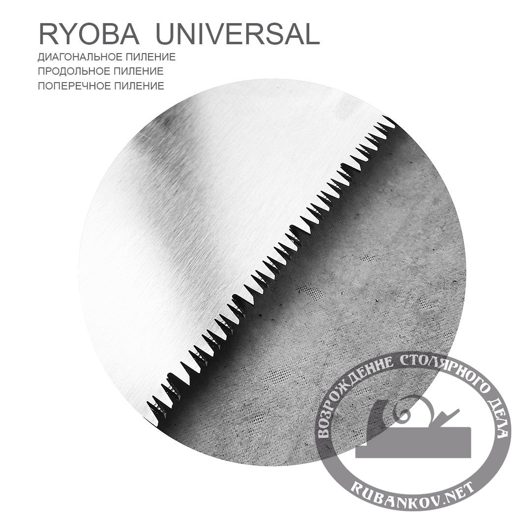 - Пила Ryoba Universal Cut Saw Универсальная пила для продольного и поперечного раскроя материала. Длина полотна - 210мм, ширина - 80мм, толщина - 0.6мм, развод зуба - 1 мм и 1,3 мм. Общая длина пилы - 505мм. Шаг зубьев для продольного пиления - 1.8мм;для поперечного - 1,6мм. Полотно с возможностью замены надежно фиксируется винтом.Зубья направлены к рукояти. Деревянная рукоять обернута искусственным ротангом (имитация из пластика).