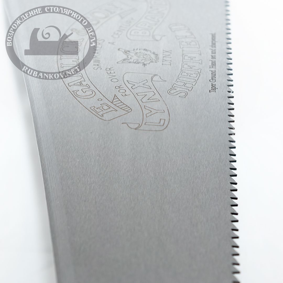 Самая большая пила под маркой Lynx (E.Garlick & Son) предназначена для распила больших заготовок. Полотна выполнены из специальной легированной стали. Зубья заточены и разведены вручную. На полотнах выгравирована марка с изображением головы рыси. Удобная закрытая рукоять вырезана из древесины бука и стилизованна под американский черный орех, пропитана датским маслом. Рукоять устанавливается на пилу с помощью 4-х плакированных латунью стальных винта. Эти пилы отличаются не только прекрасным качеством пиления, но и великолепным внешним видом. Пилы могут быть перезаточены напильником.