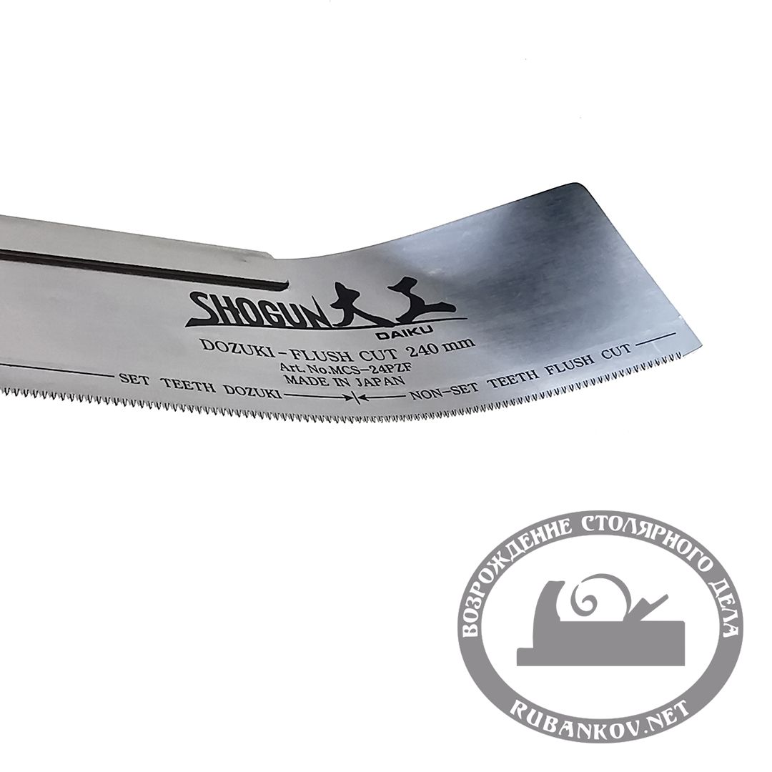 Пила обушковая Shogun Dozuki Saw, Premium, 240мм, с гибким окончанием, прямая деревянная рукоять. Пила обушковая Shogun Dozuki премиум класса, отлично подходит для пиления поперек и вдоль волокон не требующего дополнительной финишной обработки. Shogun Ryoba Premium имеет сменное полотно. Рукоять выполнена из дерева обернутого ротангом. Длина полотна - 245мм. Полотно имеет 2 рабочие зоны. Гибкая безобунковая часть пилы не имеет разводки зубьев, может использоваться как пробочная пила. Обушковая часть полотна имеет разводку 0,4мм. Ширина полотна гибкой части 60мм, толщина - 0.27мм, Толщина пропила - 0,27мм. Глубина пропила - 45мм. Общая длина пилы - 550мм. Трапециевидный закалённый зуб, шаг 27tpi. Зубья направлены к рукояти, что позволяет легко запиливаться и получать ровный рез, практически зеркальный рез.