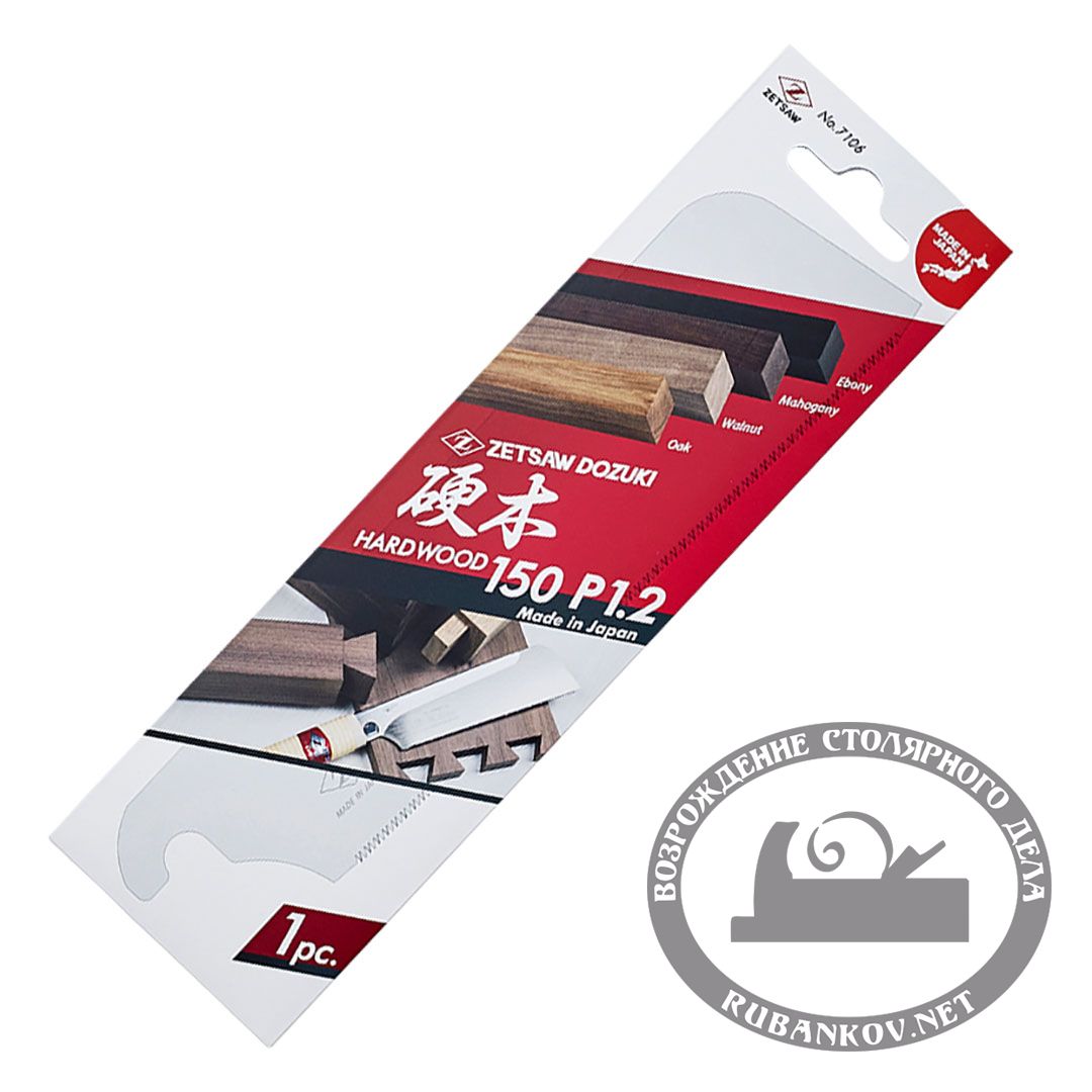 Полотно для пилы обушковой Z-Saw Dozuki Hardwood, 150мм, 21tpi, 0.3мм. Полотно для бушковой пилы предназначено для точных ювелирных столярных и реставрационных работ по твердым породам древесины. Для запиливания "ласточкиных хвостов" и других шиповых соединений. Делает практически зеркальный рез. Максимальная глубина пропила 38мм. Длина полотна - 150мм, толщина полотна 0,3мм. Шаг зубьев - 21 на дюйм. Трапециевидный японский зуб с импульсной закалкой позволяет работать по твердым породам древесины. Зубья японской пилы направлены к рукояти, что позволяет легко запиливаться и получать ровный рез и чистый рез. Используется для поперечного, продольного и комбинированного реза. Эта пила не требует заточки и готова к работе.