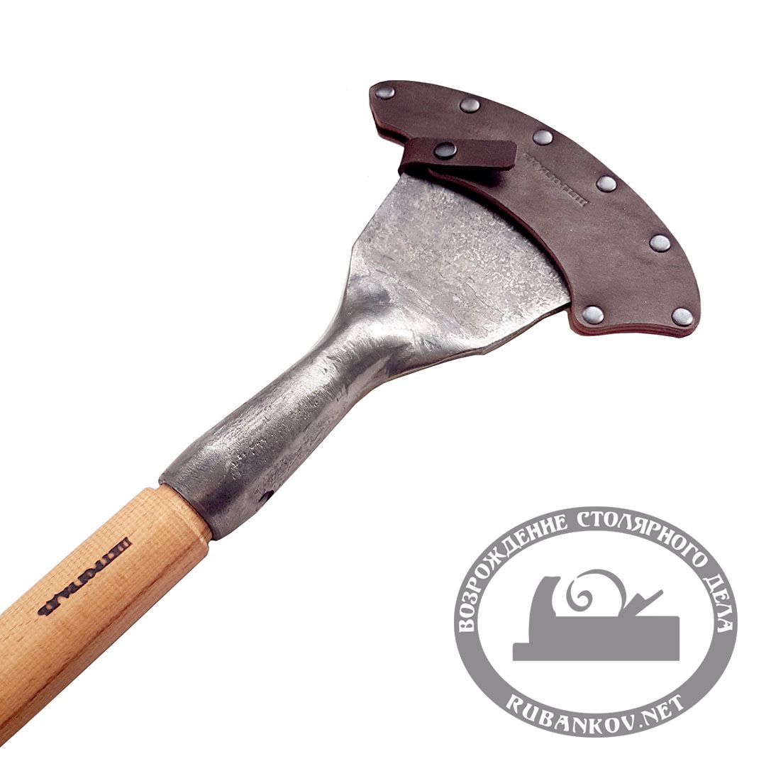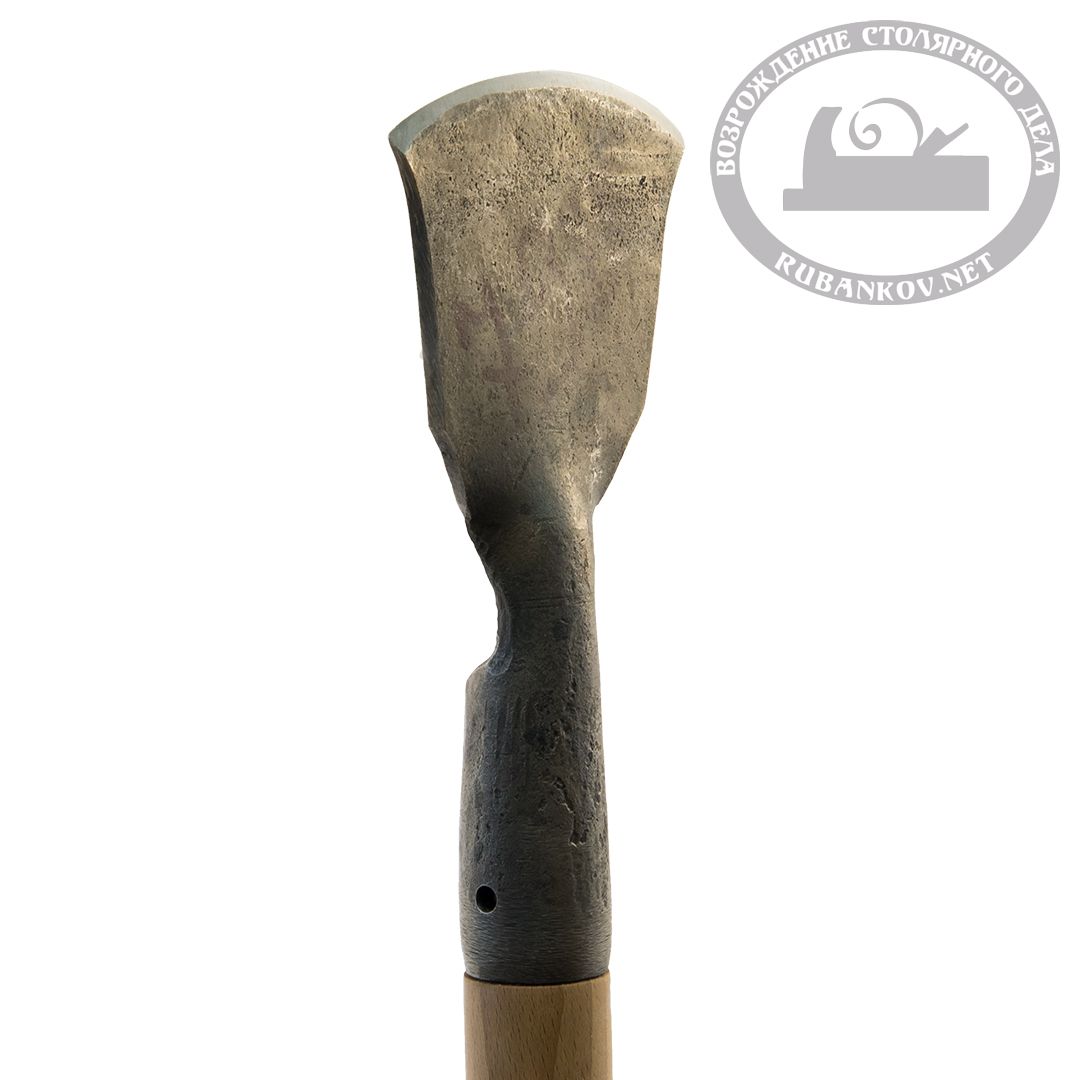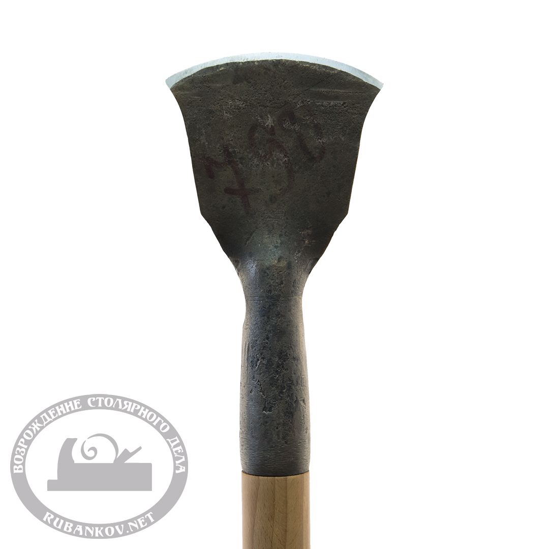 Изогнутая режущая кромка позволяет контролировать ширину и усилие резания. Кованное вручную лезвие толщиной 6 мм имеет угол заточки 30º и твердость 55-57HRC. Материал лезвия - сталь 65Г, длина режущей кромки - 110 мм. Рукоять длиной 530 мм выполнена из бука и пропитана маслом. Диаметр рукояти 34 мм. Для дополнительного крепления имеются отверстия для укрепления шурупами или штифтами. Масса - 1 кг, полная длина 650 мм. Размеры лопаток в партии могут незначительно отличаться. Производство Петроград (Россия).