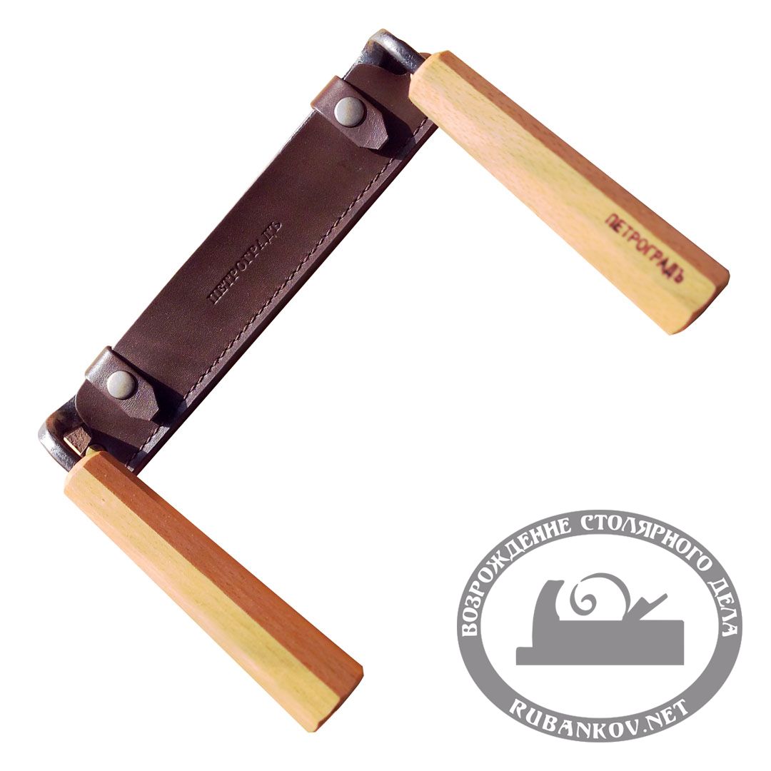Скобель ПЕТРОГРАДЪ N11. Плоский скобель с изогнутыми и перпендикулярными режущей кромке рукоятями  будет удобен при различных операциях как в плотницком деле так и в столярном: точная подгонка бревен в размер, изготовление сидений кресел, быстрый съем материала в столярном деле и пр.. Рукояти приподняты над плоскостью  лезвия  и позволяют работать вплотную к обрабатываемой поверхности. Лезвие отковано вручную из инструментальной стали 9XC и закалено до 55...58 HRC. Заточка - фаска вверх. Рукояти длиной 140 мм выполнены из бука и покрыты маслом. Длина режущей части - 170 мм или 270 мм, ширина 36 мм.  Толщина лезвия - 6 мм, угол заточки - 30 град. Поставляется в кожаном удобном чехле с застежкой на кнопках. Конструкция скобелей, а также их заточка рекомендована «Союзом плотников»  для окорочных и плотницких работ по подгонке бревен. Для других плотницких и столярных работ возможно потребуется переточка. Закалка скобелей сквозная , это позволяет неоднократно производить как доводку инструмента , так и полную его переточку.