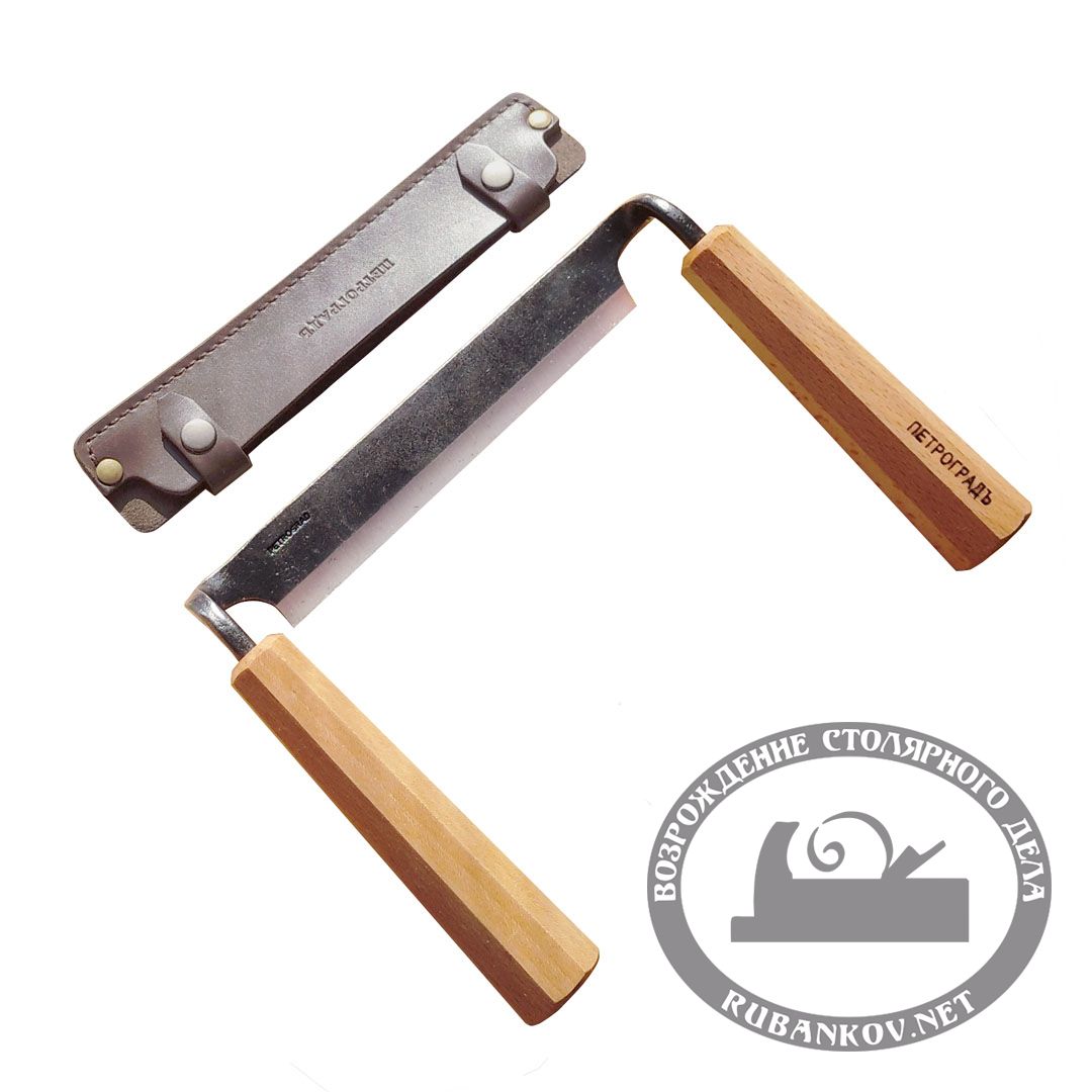 Скобель ПЕТРОГРАДЪ N11. Плоский скобель с изогнутыми и перпендикулярными режущей кромке рукоятями будет удобен при различных операциях как в плотницком деле так и в столярном: точная подгонка бревен в размер, изготовление сидений кресел, быстрый съем материала в столярном деле и пр.. Рукояти приподняты над плоскостью лезвия и позволяют работать вплотную к обрабатываемой поверхности. Лезвие отковано вручную из инструментальной стали 9XC и закалено до 55...58 HRC. Заточка - фаска вверх. Рукояти длиной 140 мм выполнены из бука и покрыты маслом. Длина режущей части - 170 мм или 270 мм, ширина 36 мм. Толщина лезвия - 6 мм, угол заточки - 30 град. Поставляется в кожаном удобном чехле с застежкой на кнопках. Конструкция скобелей, а также их заточка рекомендована «Союзом плотников» для окорочных и плотницких работ по подгонке бревен. Для других плотницких и столярных работ возможно потребуется переточка. Закалка скобелей сквозная , это позволяет неоднократно производить как доводку инструмента , так и полную его переточку.
