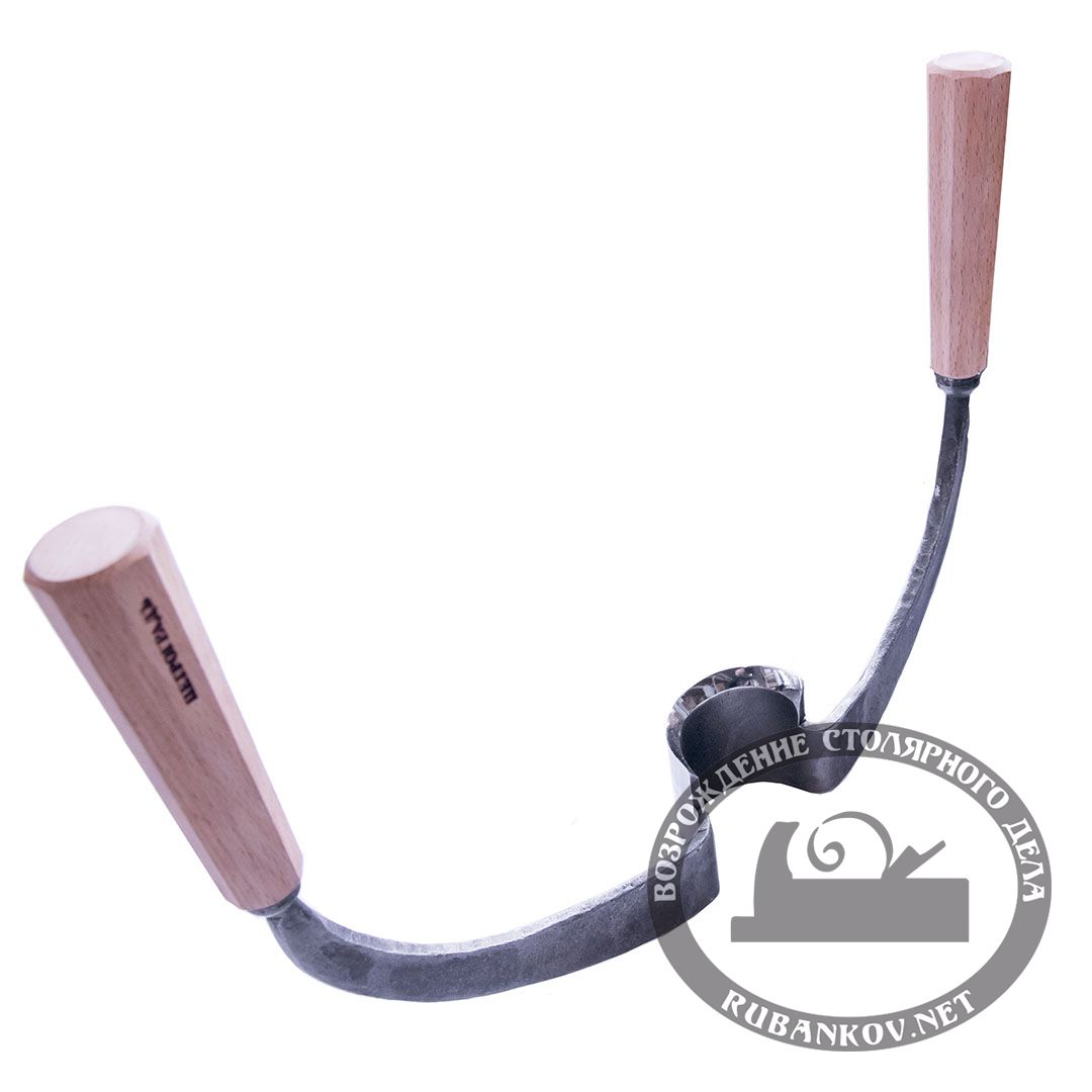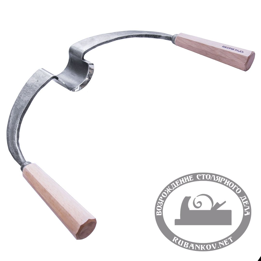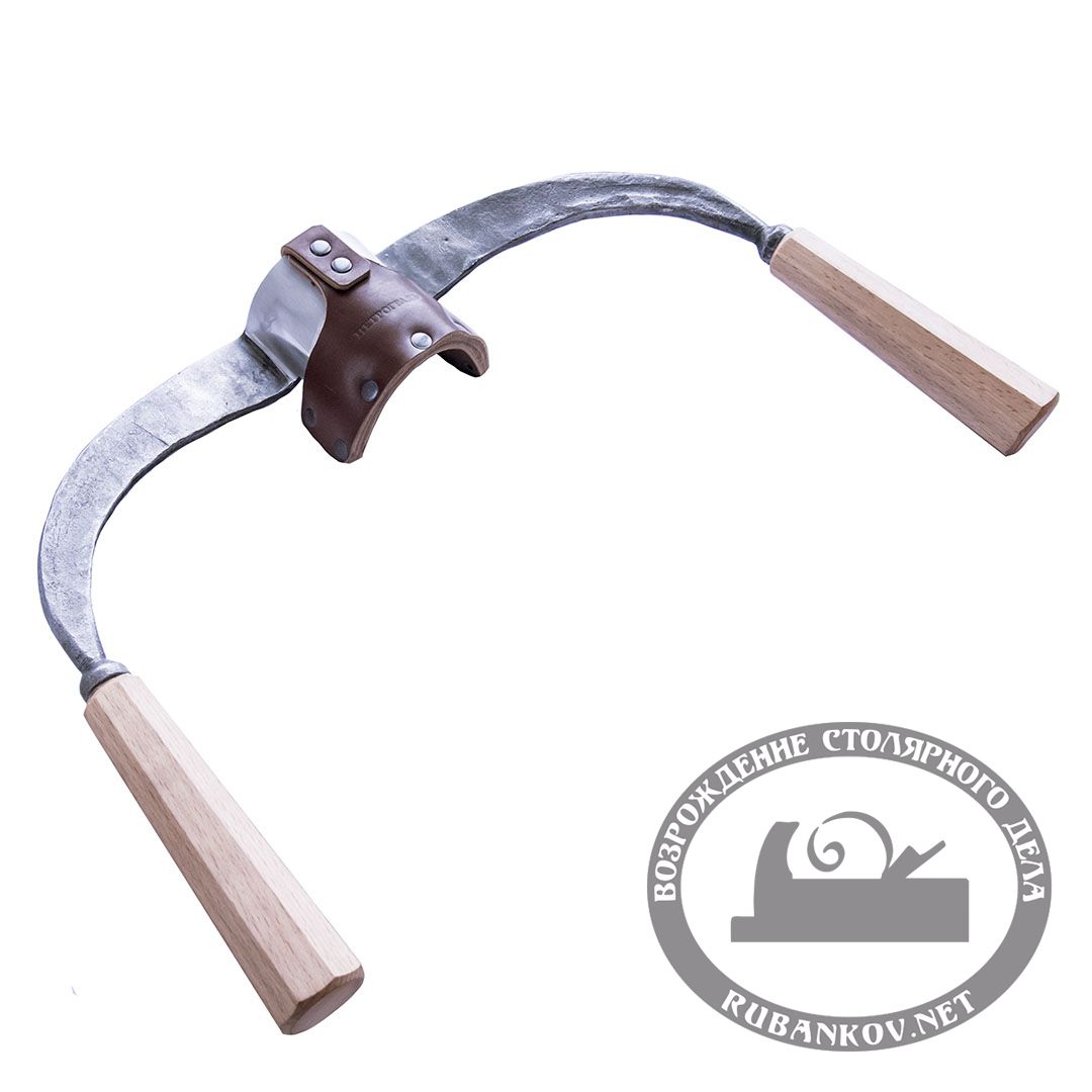 Предназначен для чистовой обработки лунного паза после тесла (убирает эффект чешуйчатости). Форма плеч скобеля позволяет поворачивать его при работе для шлифовки всей поверхности паза. Выкован вручную.