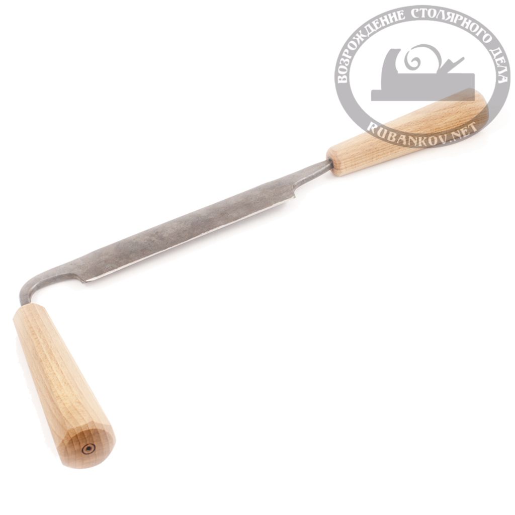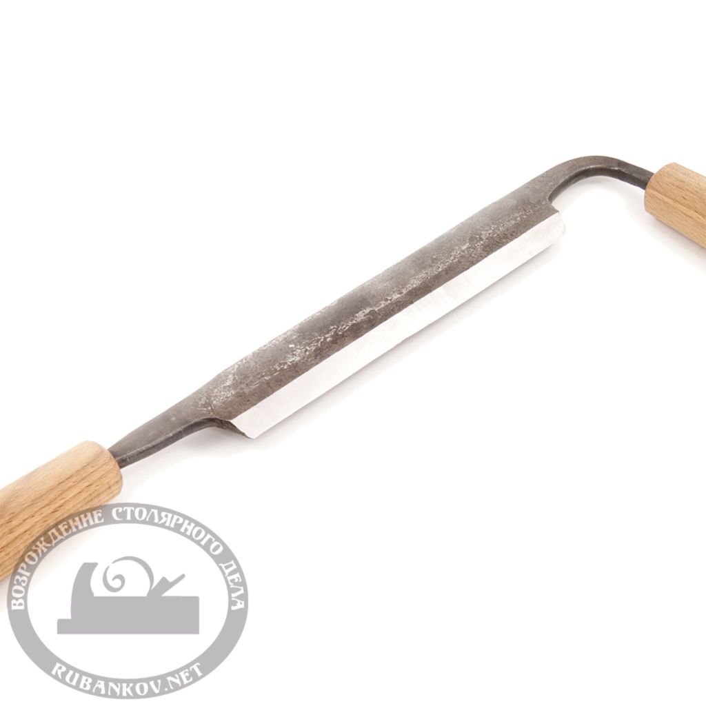 Кованый скобель имеет плоское лезвие и две взаимно перпендикулярных рукояти. Это позволяет удобно работать с круглыми заготовками,где помимо тянущего усилия, необходимо создать и вращательное. Будет особо полезен бондарям и плотникам. Лезвие отковано вручную из инструментальной стали 9хс и закалено до 55...58 HRC. Рукояти длиной 140 мм выполнены из бука и пропитаны маслом. Длина режущей части - 170 мм, ширина 36 мм. Толщина лезвия - 6 мм, угол заточки - 30 град. Поставляется в кожаном удобном чехле с застежкой на кнопках.